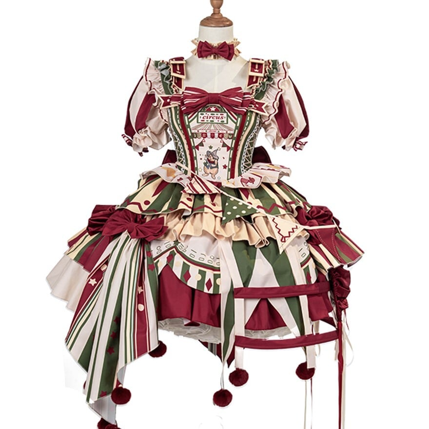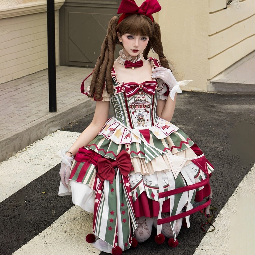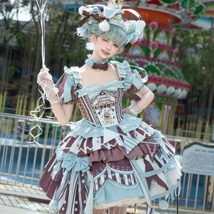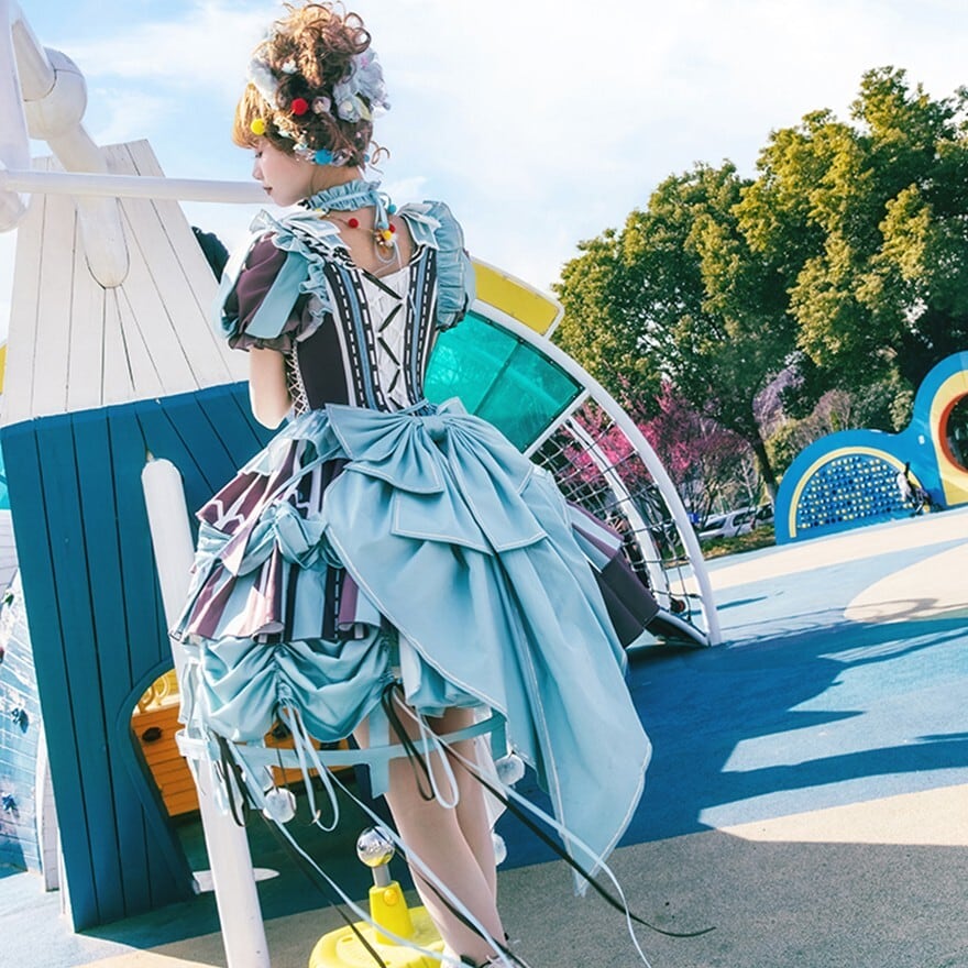 ふわっと広がるスカートには、大きなリボンやフリル、ポンポンがあしらわれ、まるでサーカスのテントやピエロの衣装のよう。コルセット風のデザインやアシンメトリーなスカート丈も特徴的で、どこから見ても華やかで楽しい気分になれる一着です。