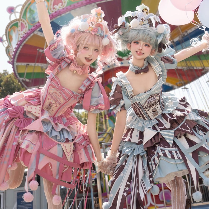 カラフルなストライプと、回転木馬などのサーカスモチーフが描かれた、遊び心あふれるロリータワンピースです。