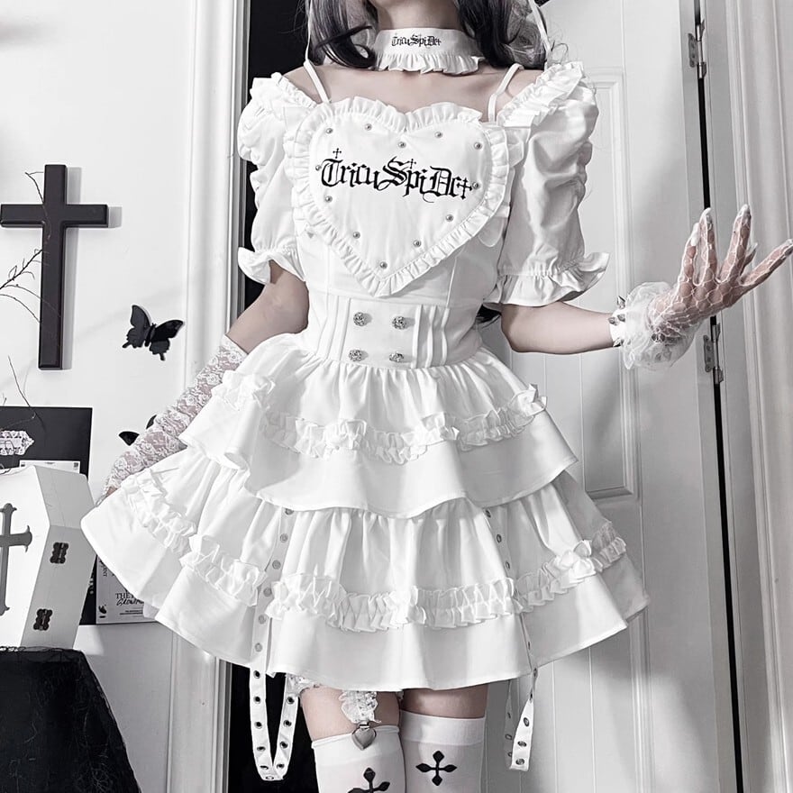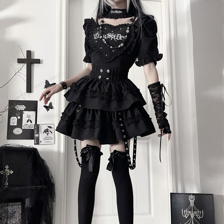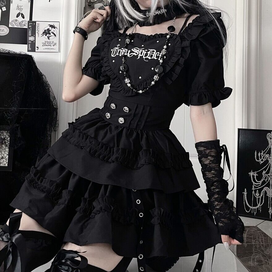 ハート形の胸当てとティアードスカートが特徴的な、ゴシックロリータワンピースです。