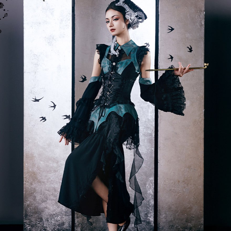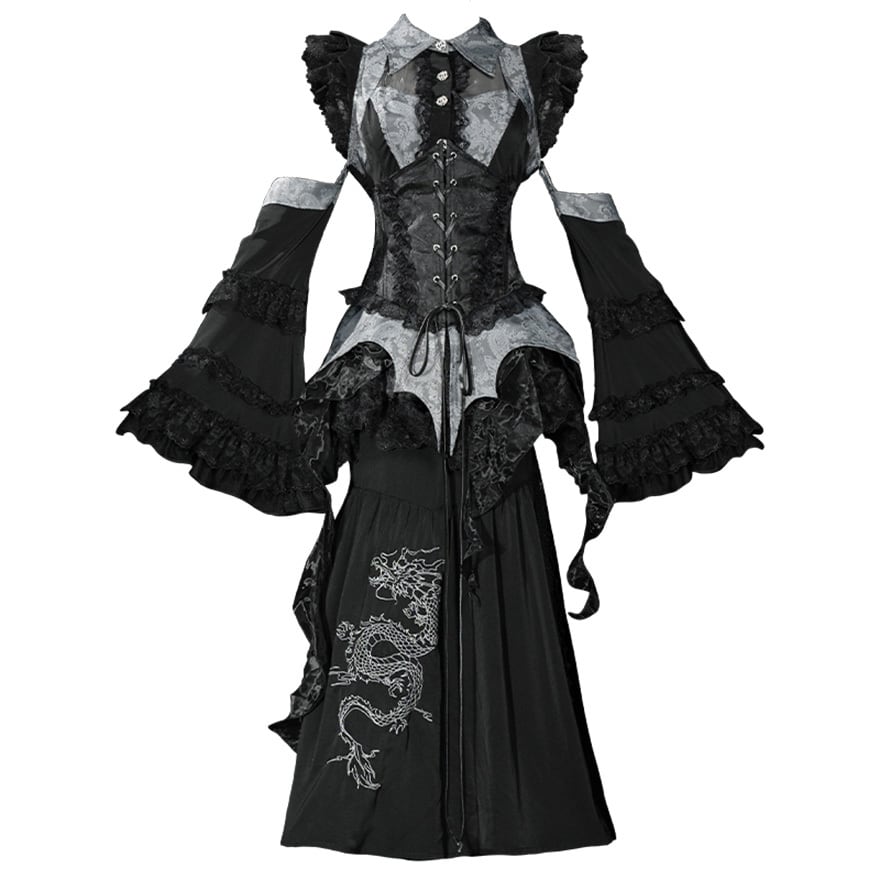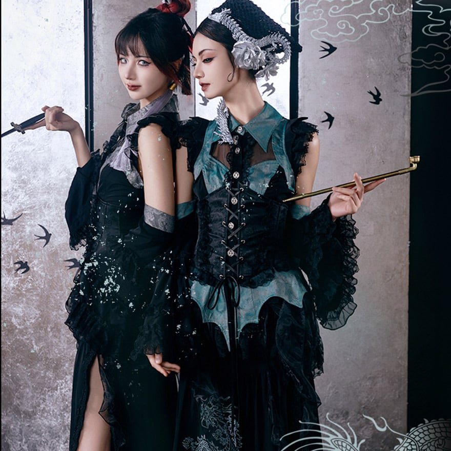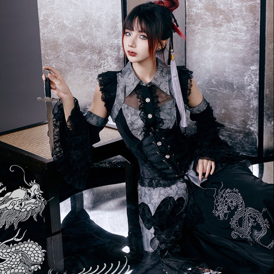 西洋のゴシック様式と東洋の神秘的な美しさが融合した、唯一無二の中華風ゴスロリドレスセットです。