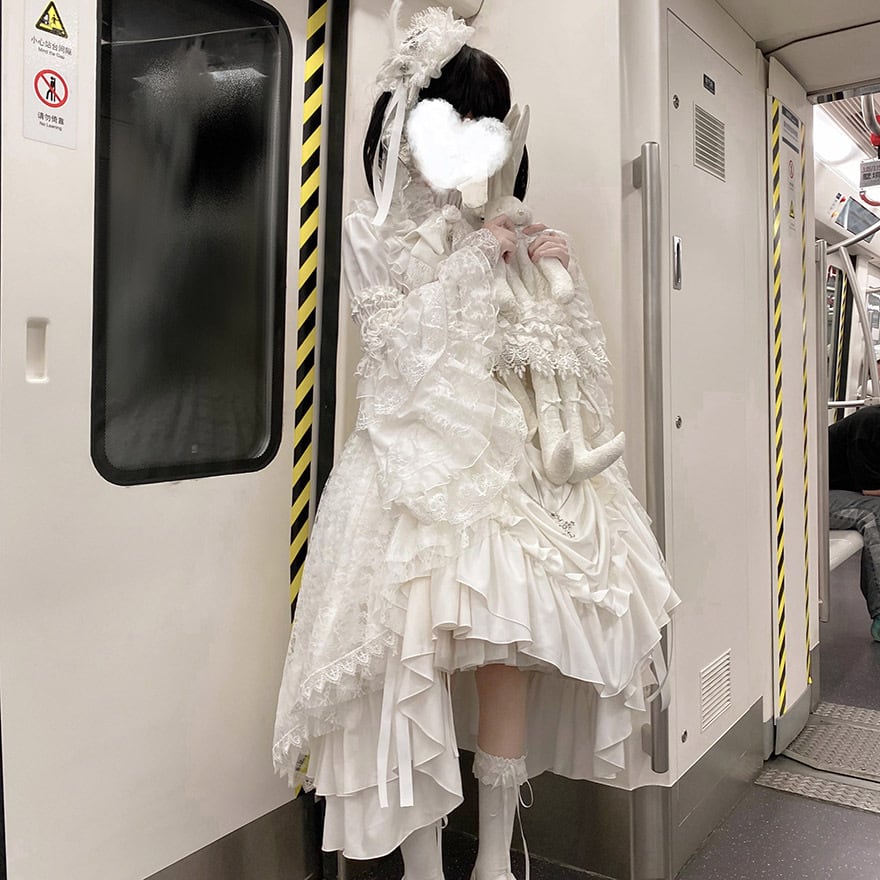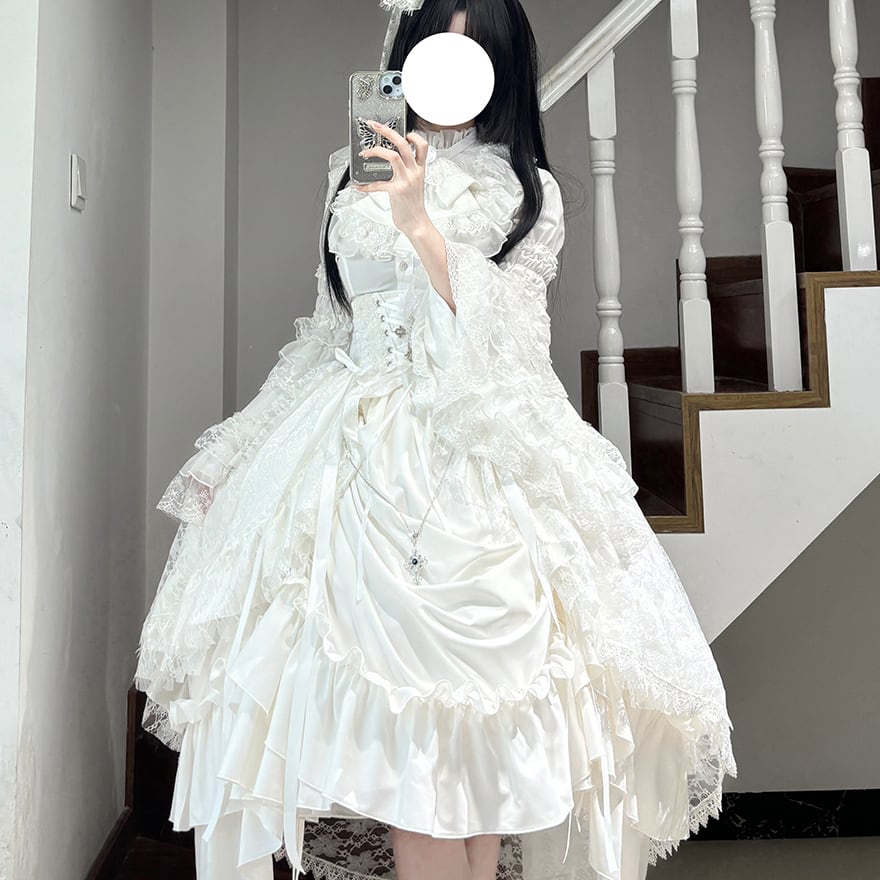 優雅な姫袖、ウエストをきゅっと絞る編み上げのビスチェ、そして前が短く後ろに長く引くドラマティックなフィッシュテールスカートが、完璧なお人形のようなシルエットを創り出します。胸元で揺れる十字架のペンダントと、付属の蝶ネクタイが、より一層世界観を深めます。