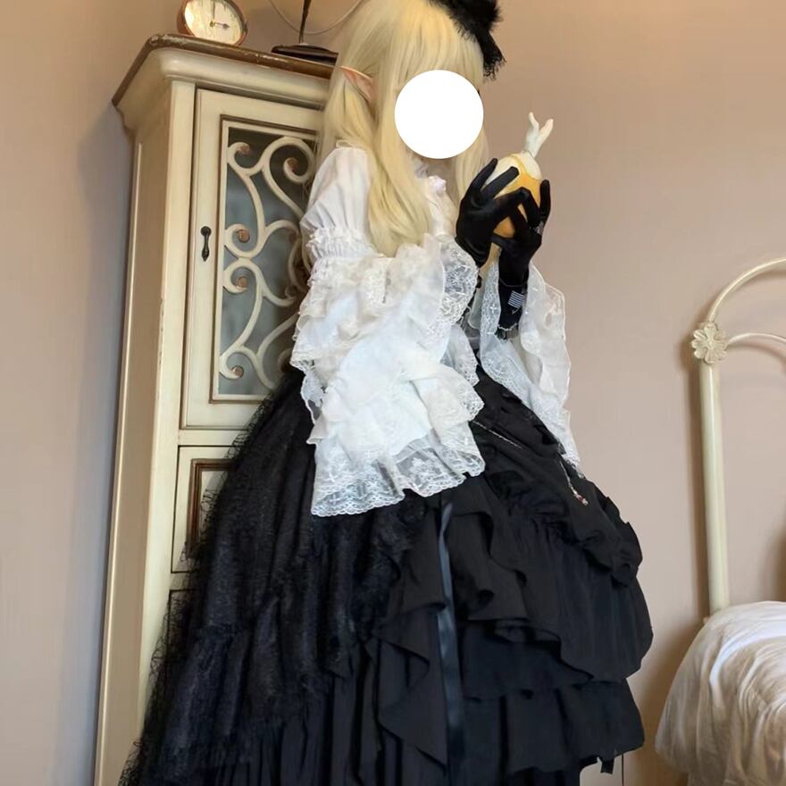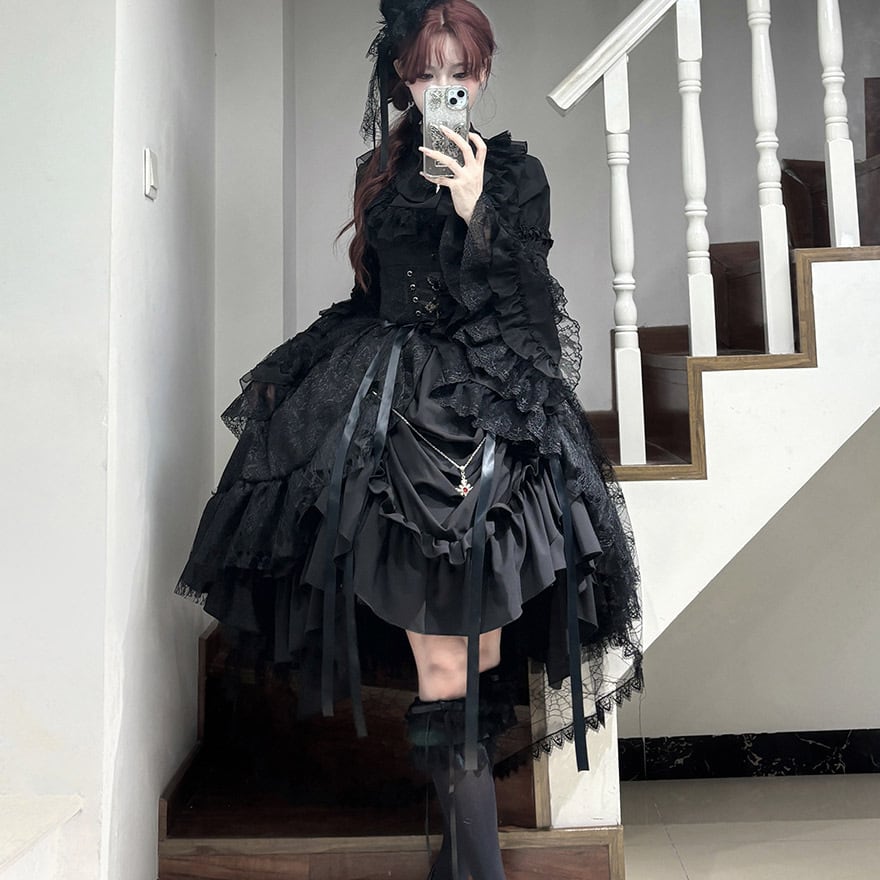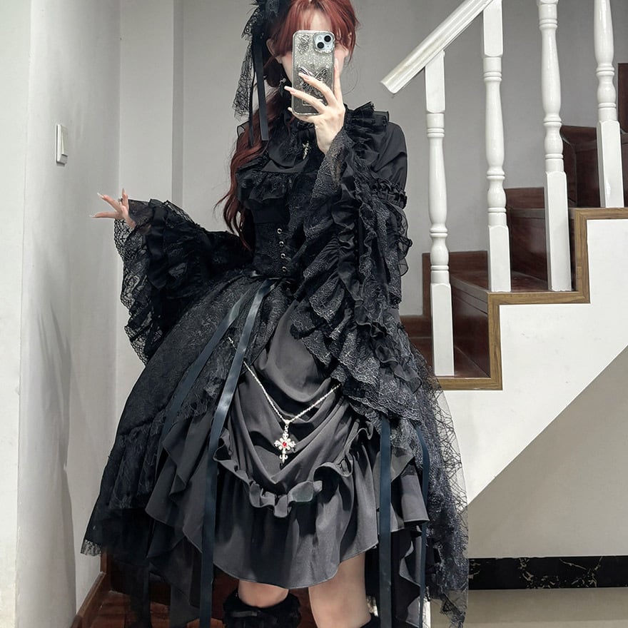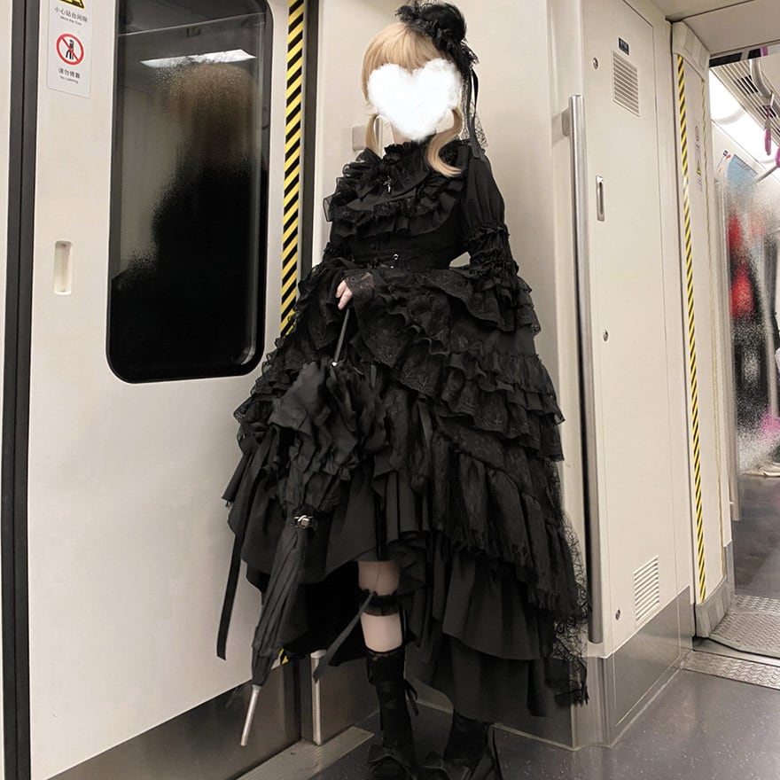 ブラウス、幾重にもフリルが重なるスカートが一体となった、豪華絢爛なゴシックドレスのセットアップです。