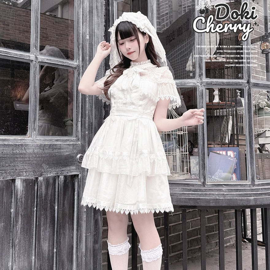 シースルーのパフスリーブとレースのスタンドカラーが、繊細でクラシカルな印象を与えます。ウエストは編み上げデザインでキュッと引き締め、幾重にも重なったフリルとレースのティアードスカートが、まるでお人形のような完璧なシルエットを演出します。