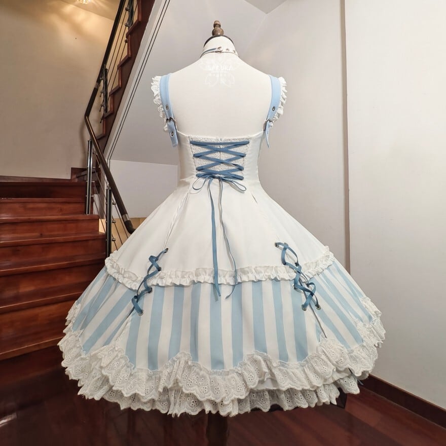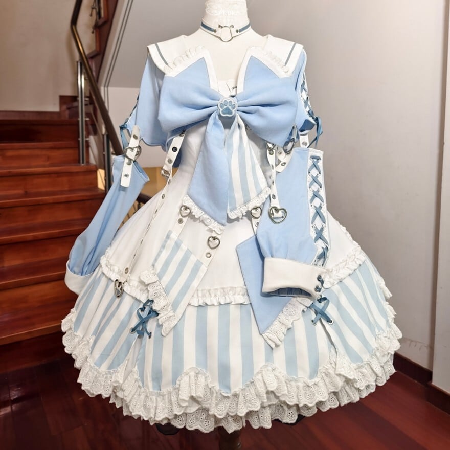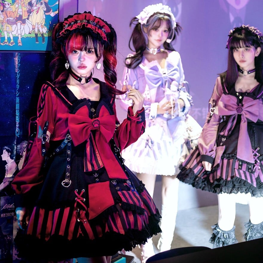 淡い水色と白、あるいは赤と黒、またはラベンダーと黒のポップなストライプ柄が目を引く、JSKワンピース、上着、大きなリボンの3点セットです。