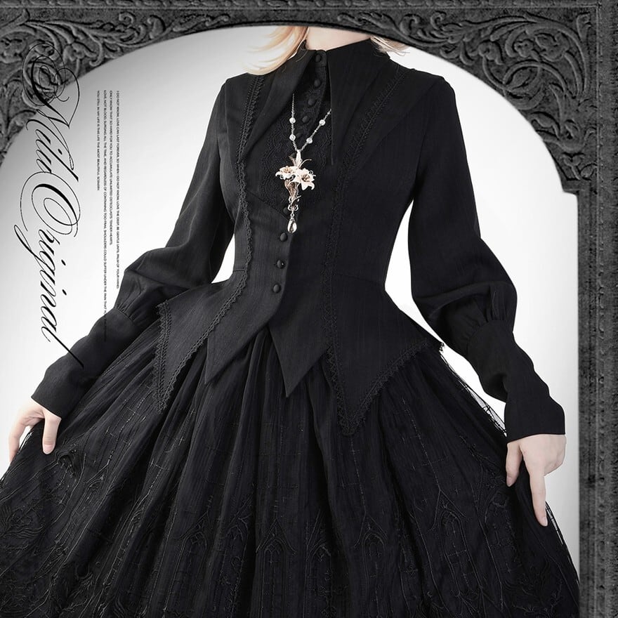 前身頃のレースとくるみボタンが上品な印象を与え、ウエストから広がる**燕尾(えんび)**のようなアシンメトリーなデザインが個性的です。