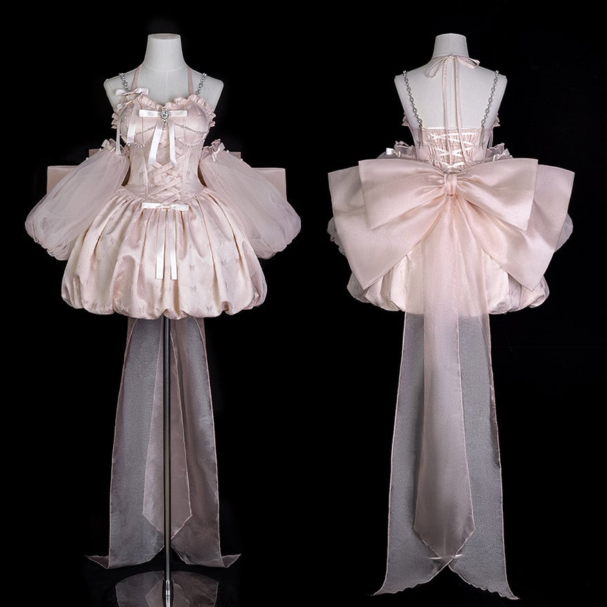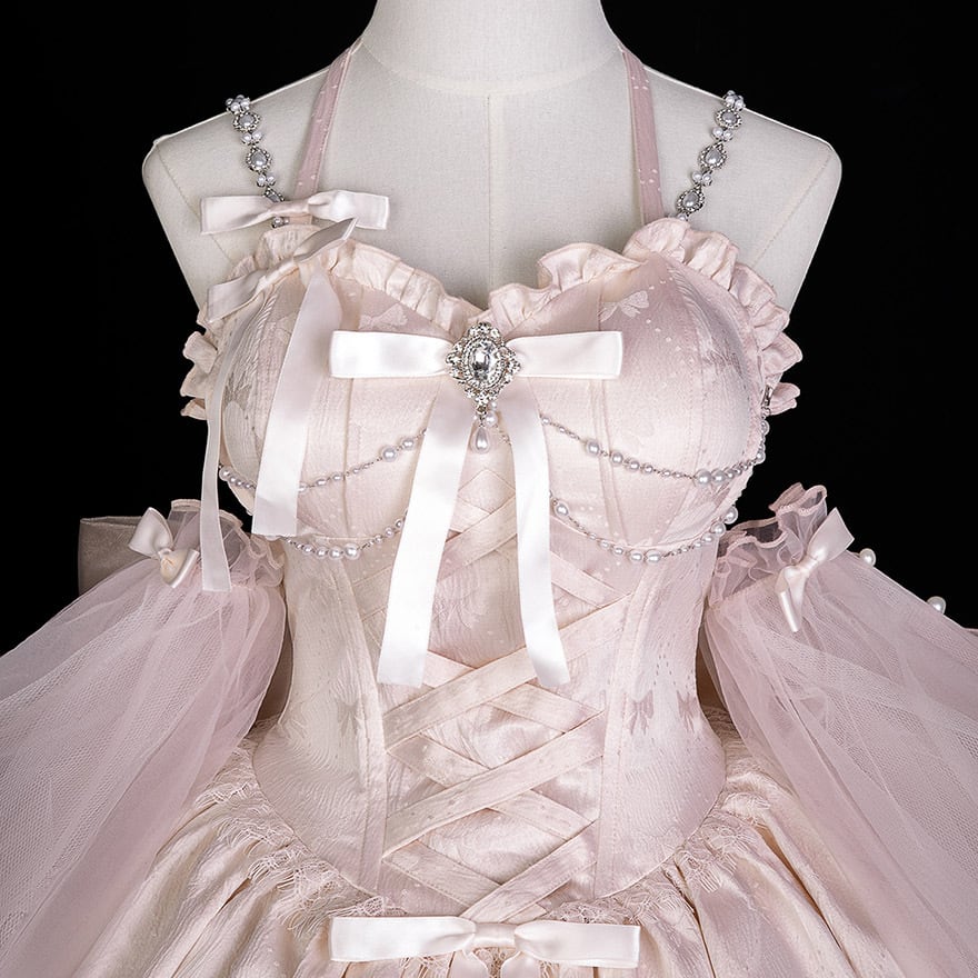 光沢のある淡いピンクの生地に、同色のリボン柄が織り込まれた甘ロリ系のプリンセスドレスです。