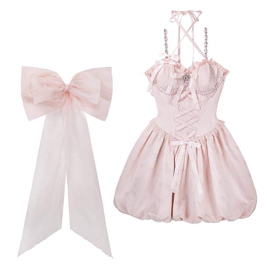 胸元のレースアップデザインと、きらりと光るビジューが顔周りを華やかに演出。ふんわりとしたチュールの姫袖と、バルーンのように膨らんだスカートが、まるでお人形のようなシルエットを作り出します。
