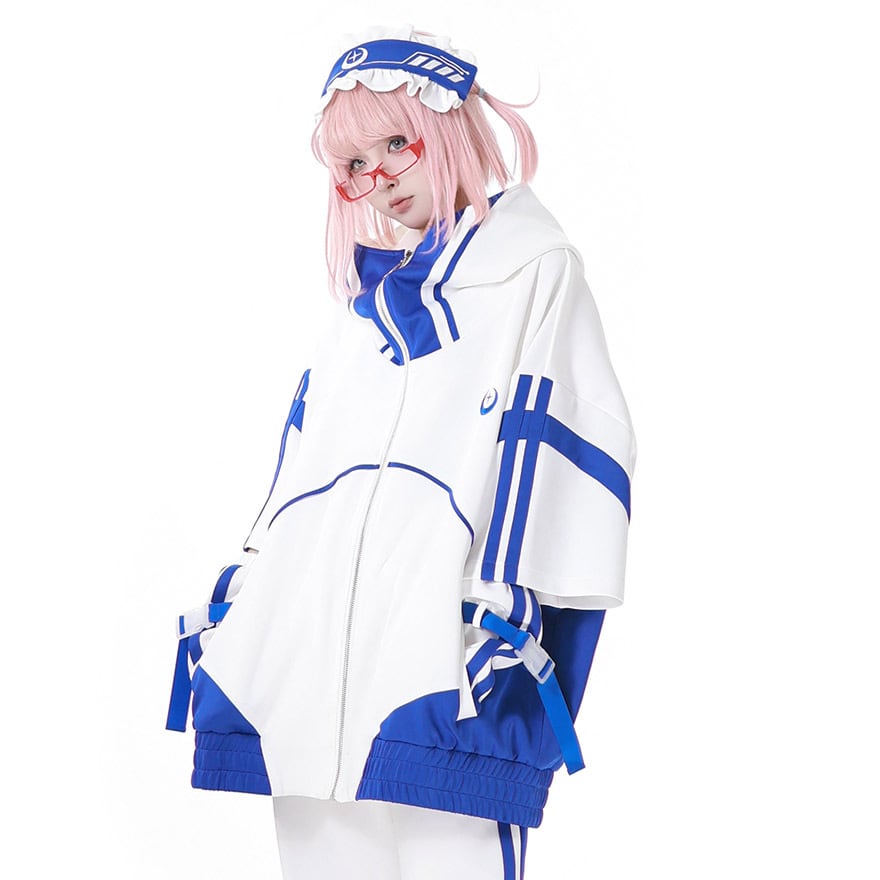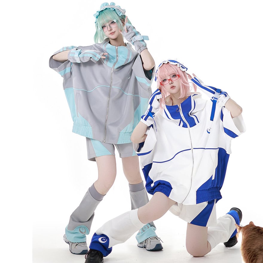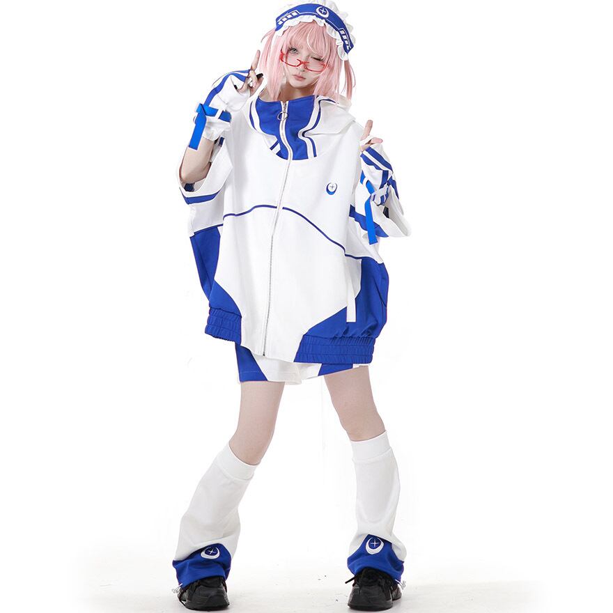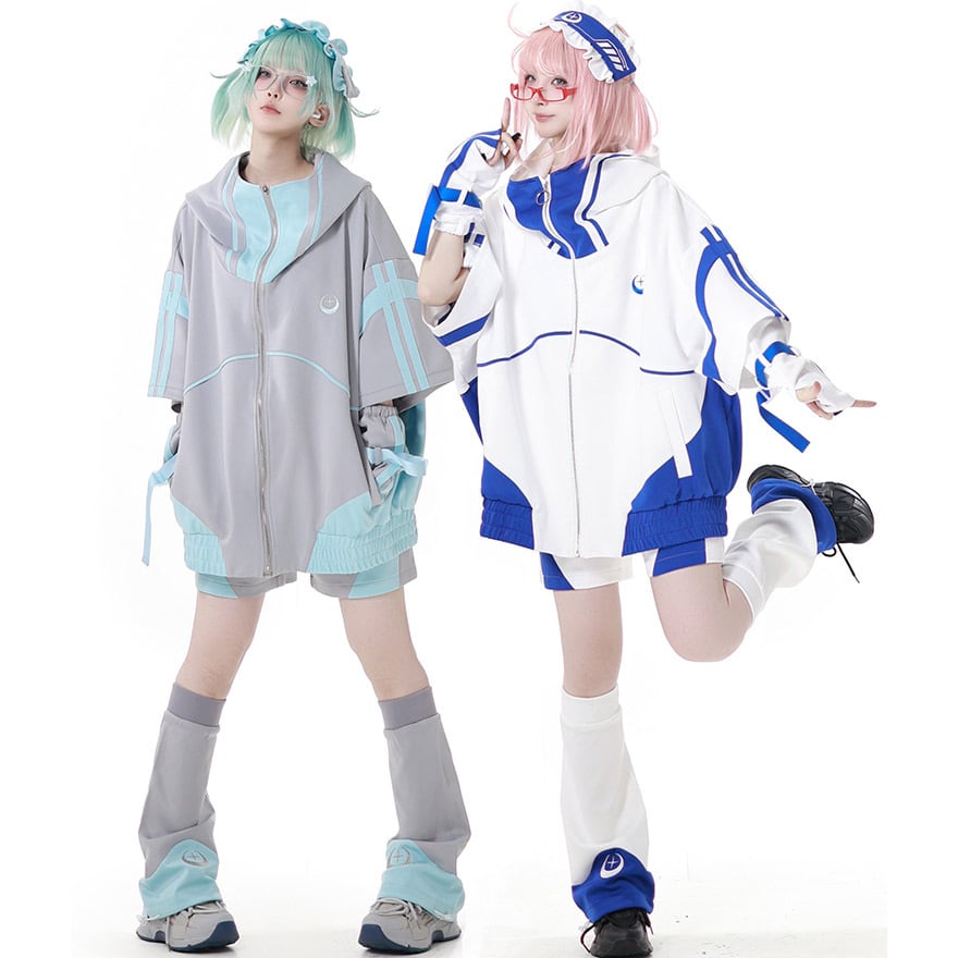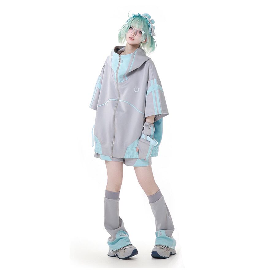 これ一つで全身コーデが完成する、パーカー、ショートパンツ、カチューシャ、アームカバー、レッグウォーマーの豪華5点セットです。