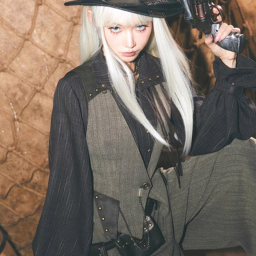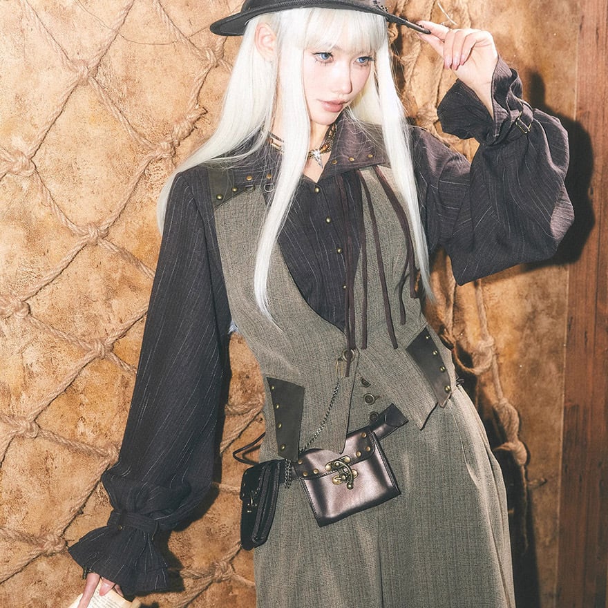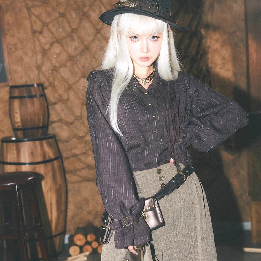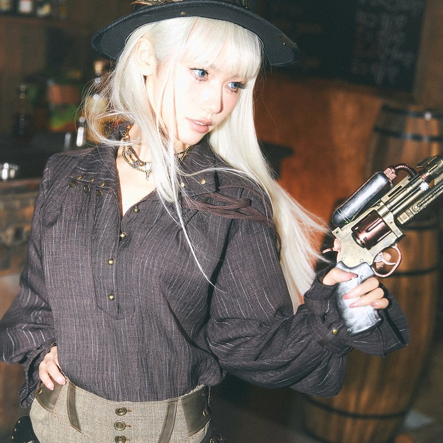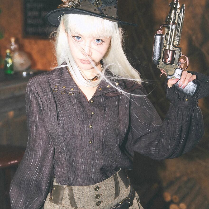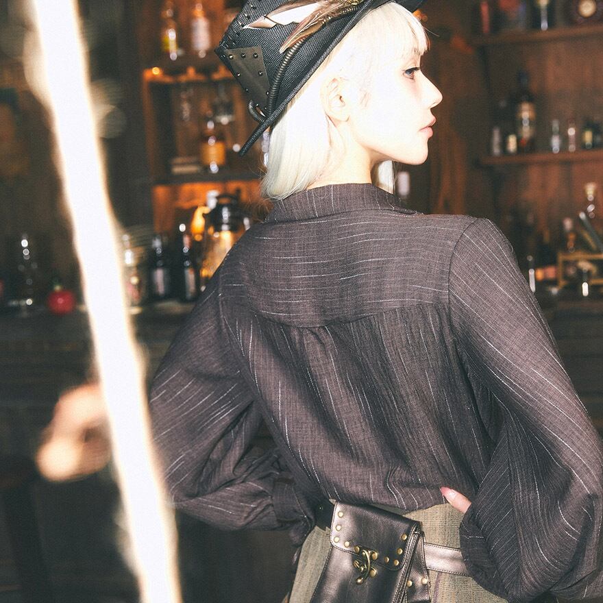 ヴィンテージ感あふれるピンストライプ生地を使用した、クラシカルなスチームパンクブラウスです。