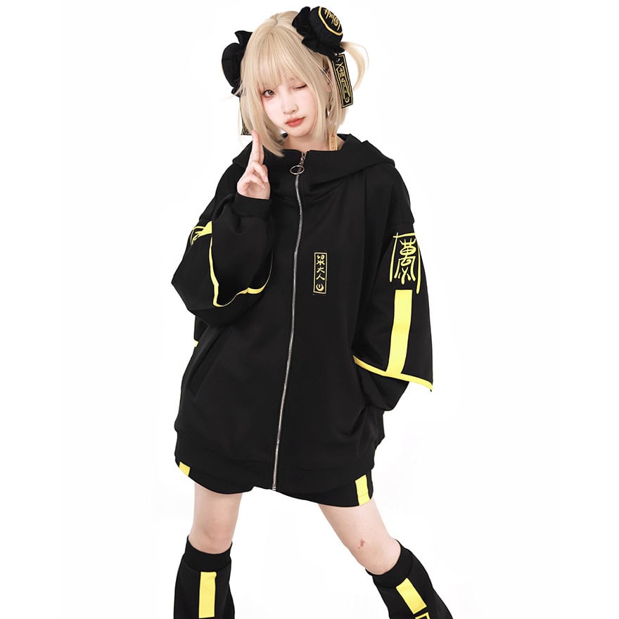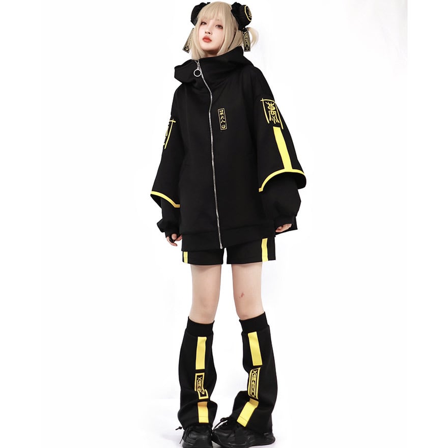 ブラックを基調とした生地に、鮮やかなイエローのラインと漢字のモチーフが映えるサイバーなデザイン。