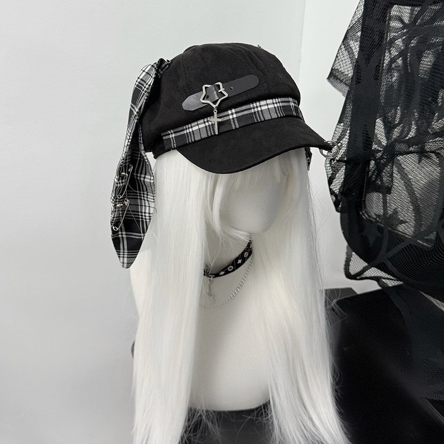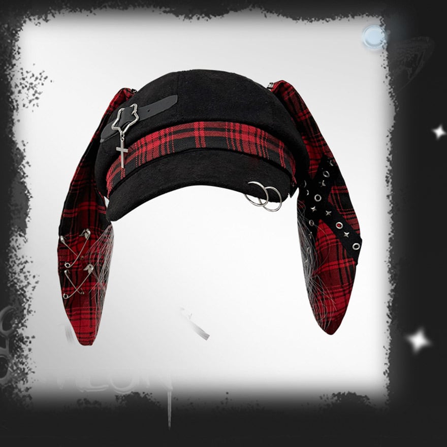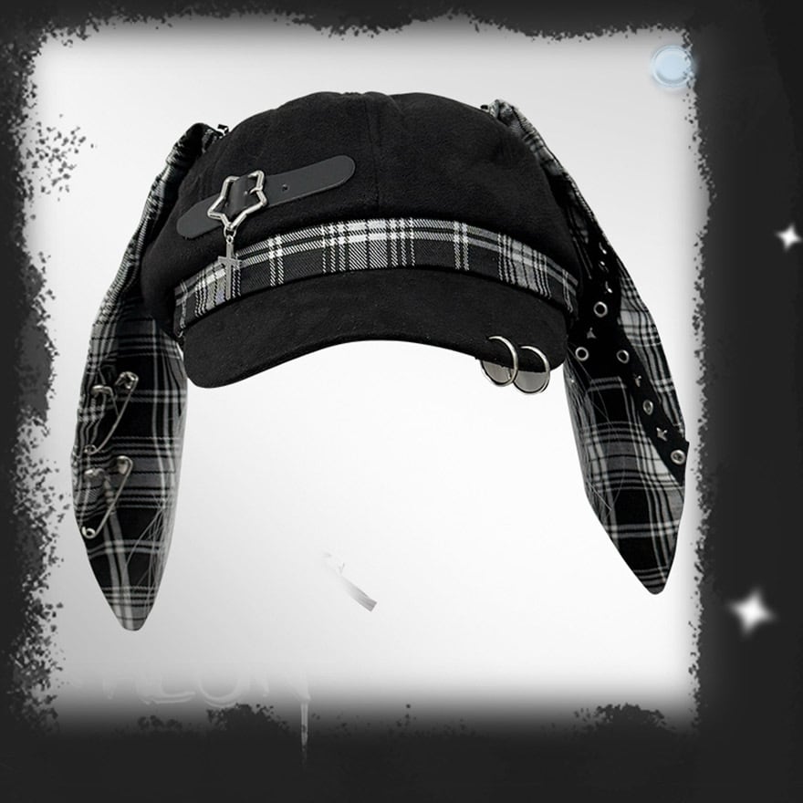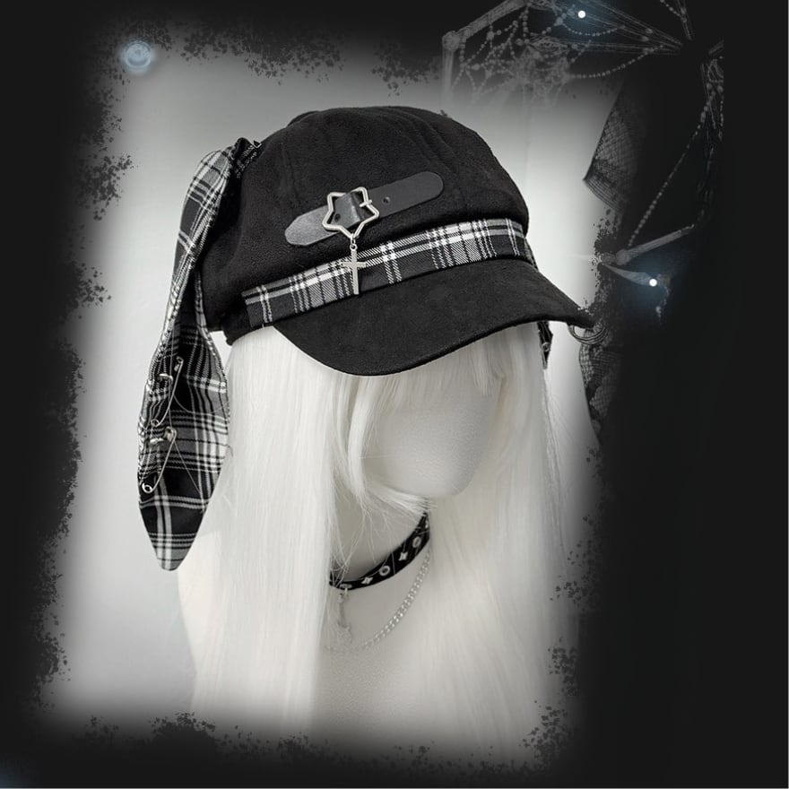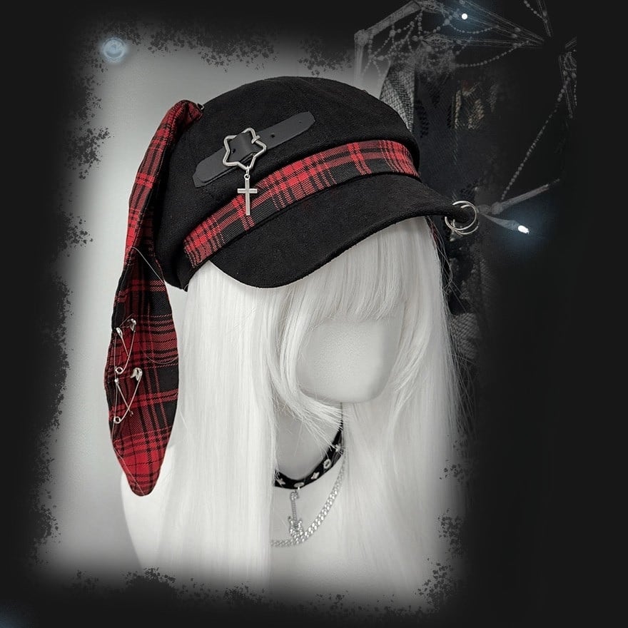 定番のキャスケットに、チェック柄の長い垂れ耳(うさ耳)をドッキングさせた、病みかわいいデザインの帽子です。