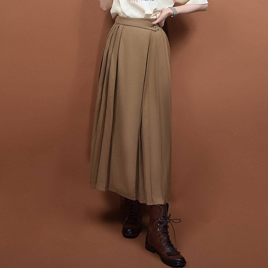カーキ色の生地に、太めのプリーツが均等に施された、クラシカルで品のあるロングスカートです。