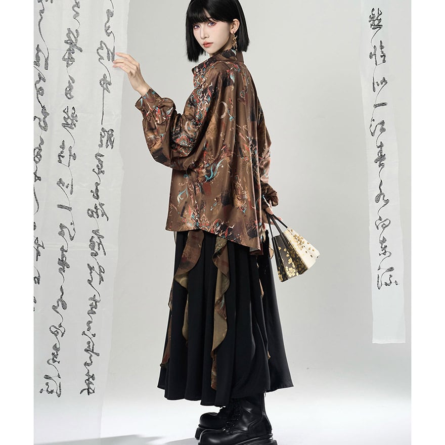 幻想的な東洋の絵画をそのまま閉じ込めたような、芸術的なプリントが全面に施されたオーバーサイズブラウスです。