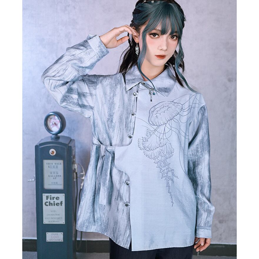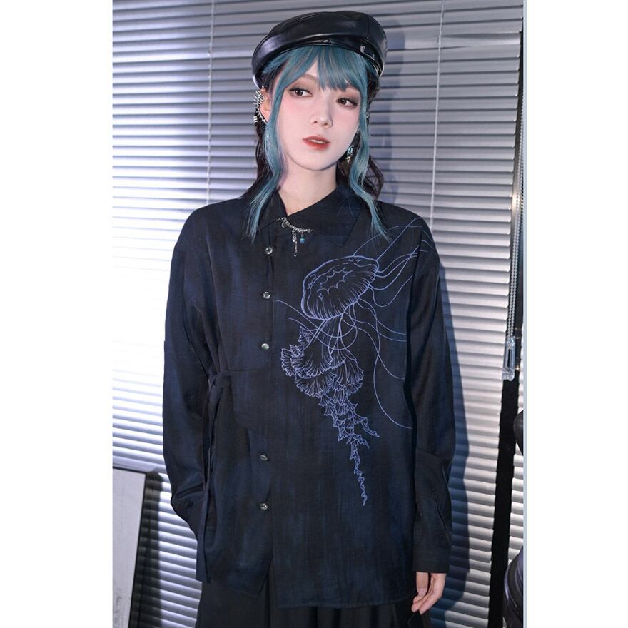 サブカル系地雷 シャツ クラゲ プリント柄 アラサーファッション ストリートファッション