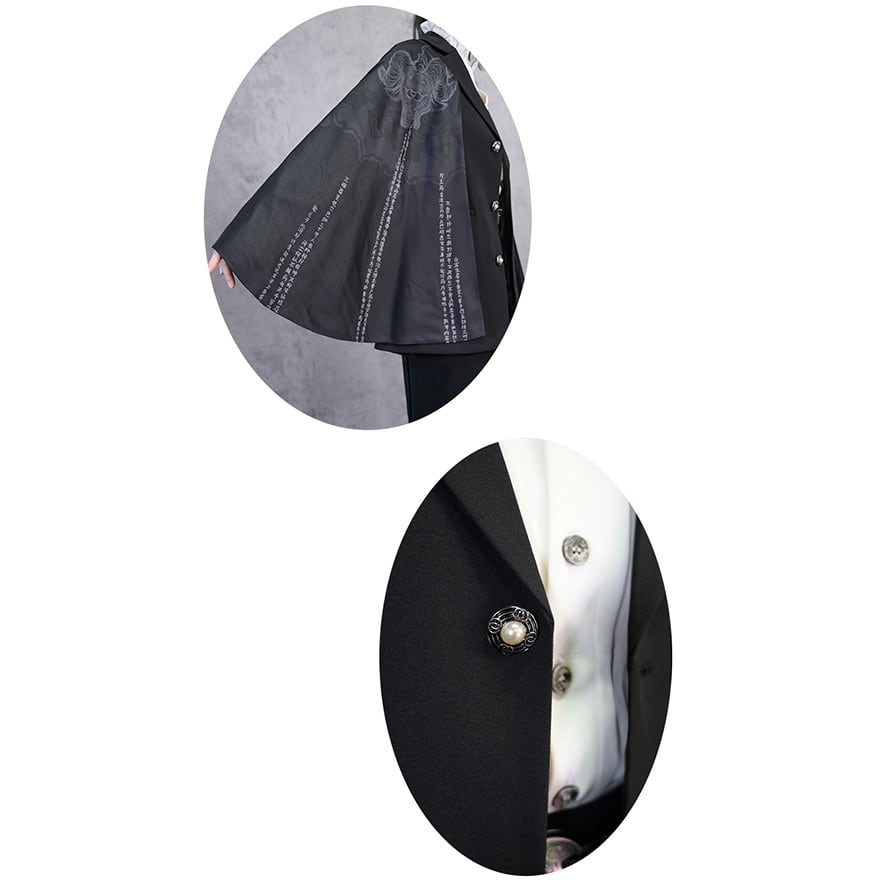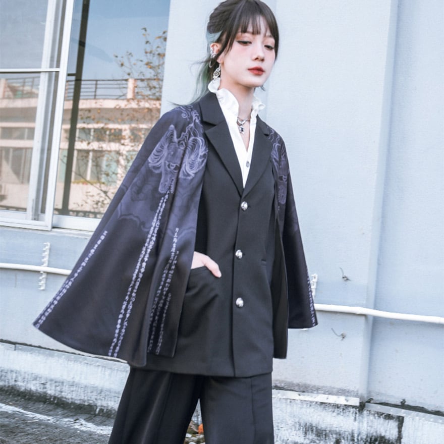 流れるように広がる袖には、水墨画を思わせる神獣のグラフィックと、達筆な漢字が縦に連なり、知的でミステリアスな雰囲気を醸し出します。