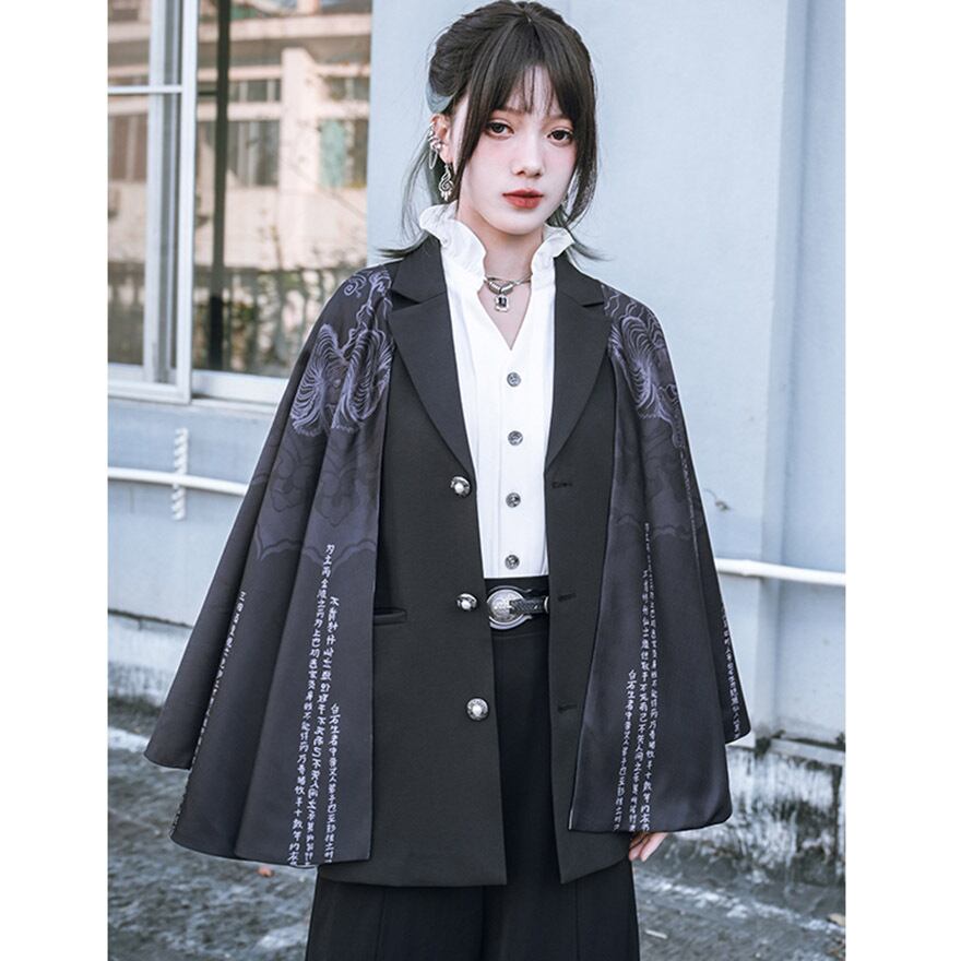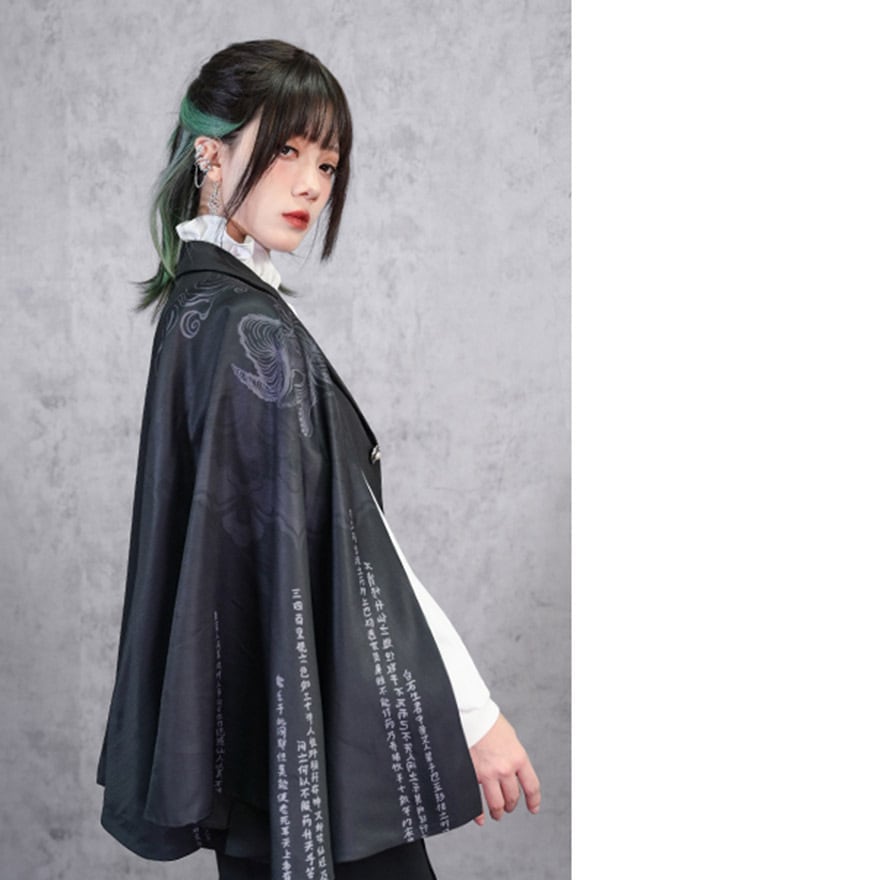 関連キーワード: #中華風 #羽織り #ジャケット #モード系 #ストリートファッション #サブカル #個性的 #漢字 #プリント #ドッキング #和洋折衷 #黒コーデ #大人ファッション