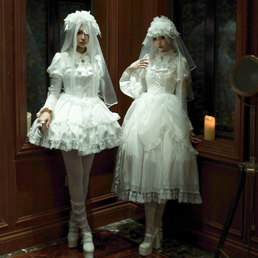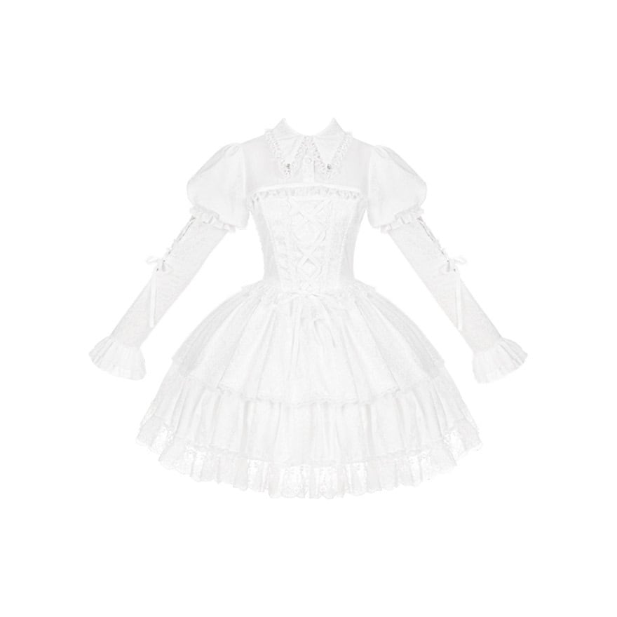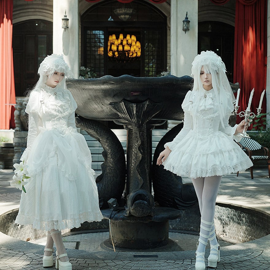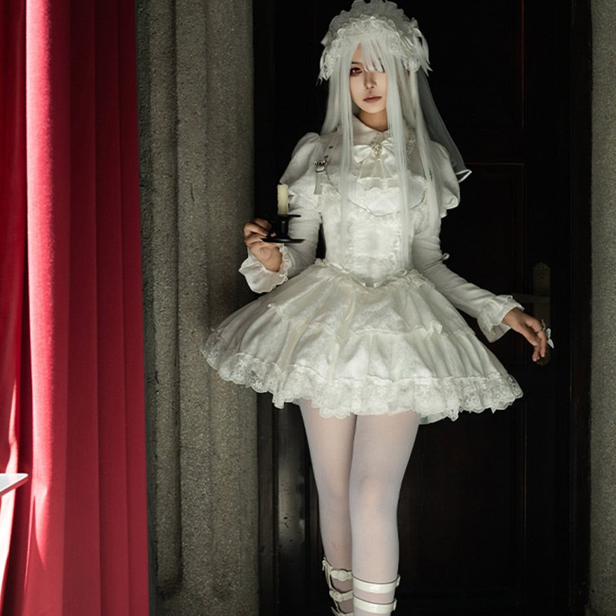 全身を穢れのない純白で統一した、クラシカルで可憐なミニ丈ワンピースセットです。