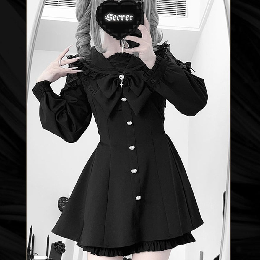 レースとフリルで縁取られた大きな襟が顔周りを華やかに演出し、胸元の大きなリボンと十字架のチャームがダークな世界観を引き立てます。