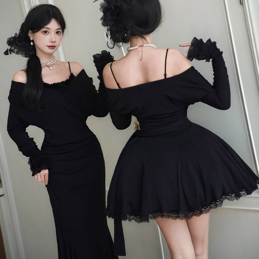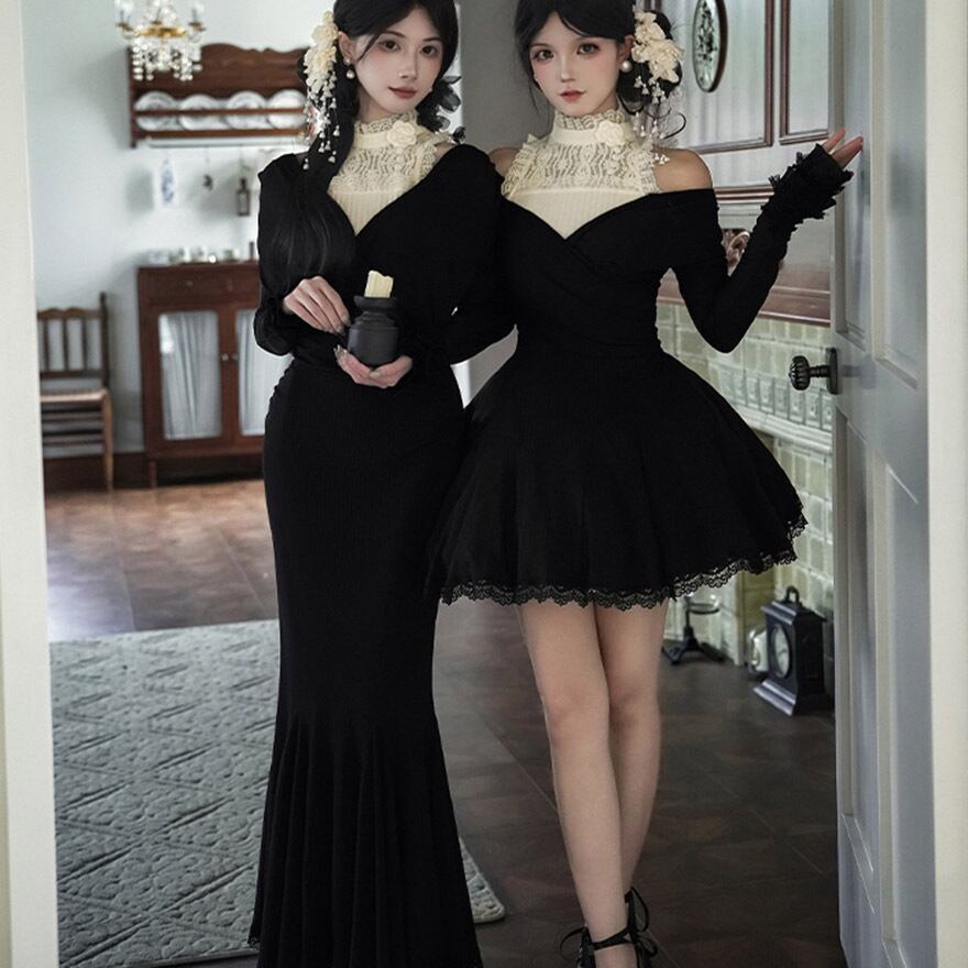 シックな黒のミニ丈ドレスに、生成色のレースインナーと髪飾りがセットになった豪華3点セットです。