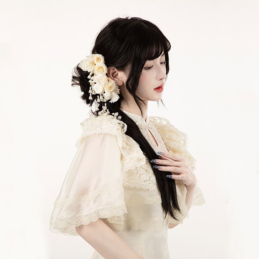 大きく開いた胸元や肩から繊細なレースを覗かせることで、上品な肌見せと華やかさを演出。きゅっと絞られたウエストからふわりと広がるスカートのラインが、美しいシルエットを描きます。袖口と裾のフリルが、クラシカルな中に可憐な印象をプラスします。