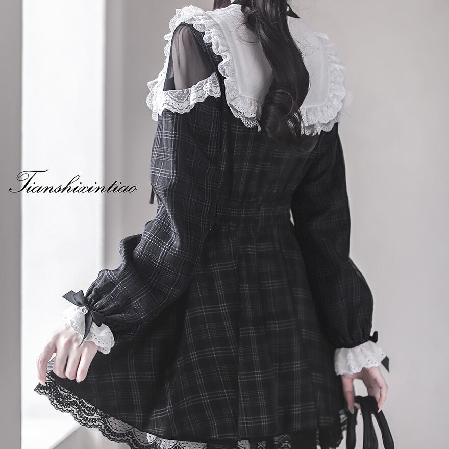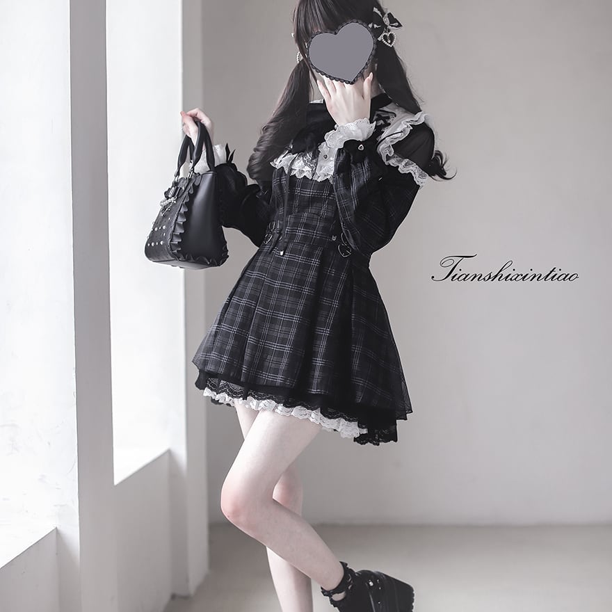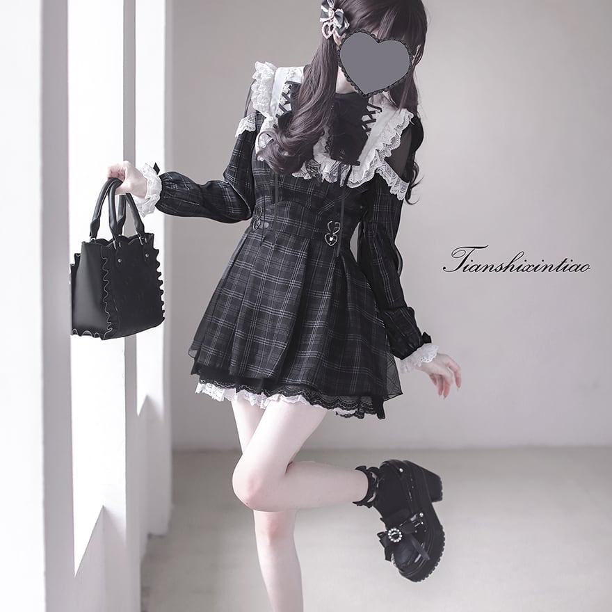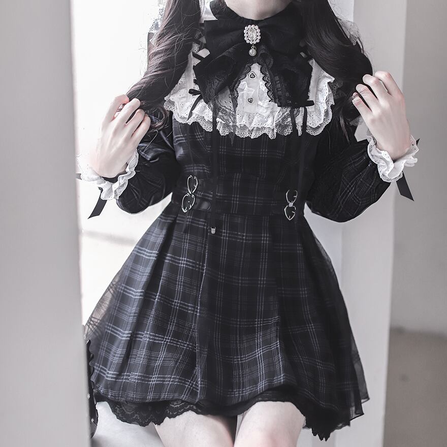 ブラックを基調としたシックなチェック柄に、たっぷりの白レースをあしらった量産型ワンピースです。