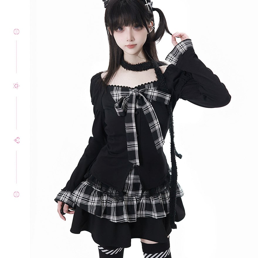 袖口はリボンと同じチェック柄で切り替えられ、裾には繊細な黒レースがあしらわれるなど、細部までこだわりが詰まっています。