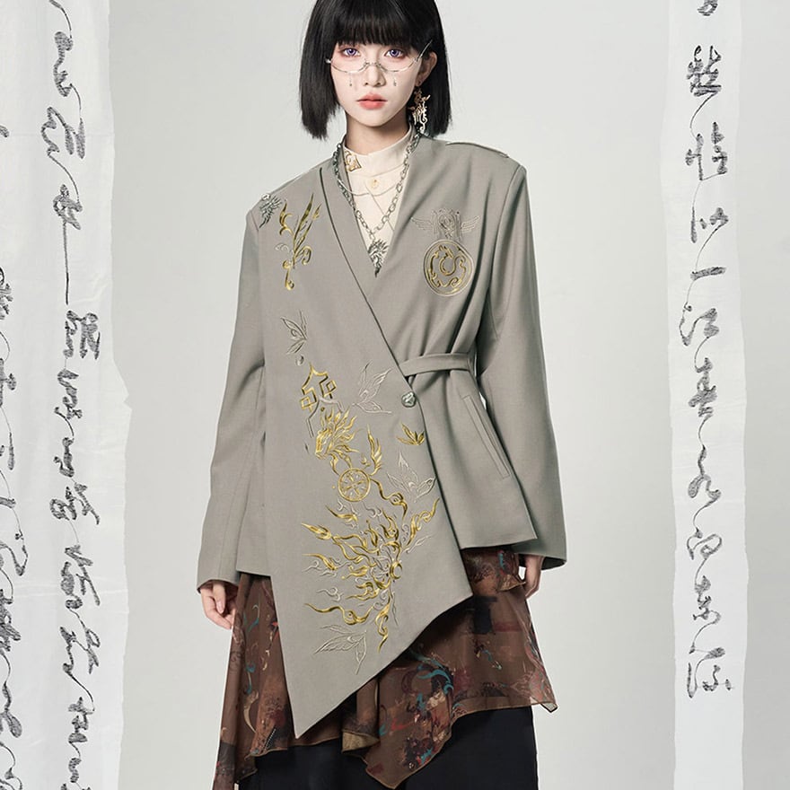 現代的なオーバーサイズのシルエットに、伝統的な刺繍を施したスタイリッシュなジャケットです。