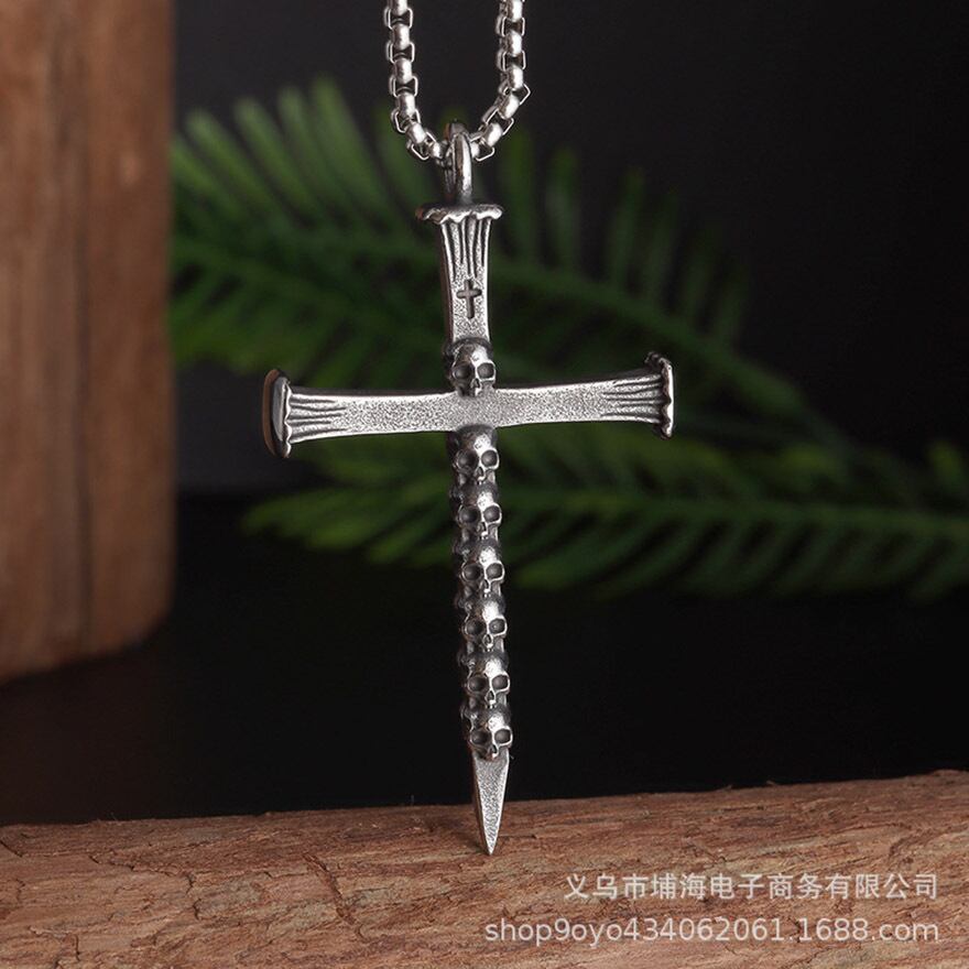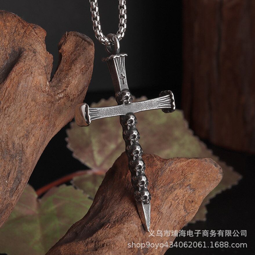聖なるモチーフであるクロスに、死を象徴するスカルと無骨な釘を組み合わせた、冒涜的で美しいデザインが魅力。