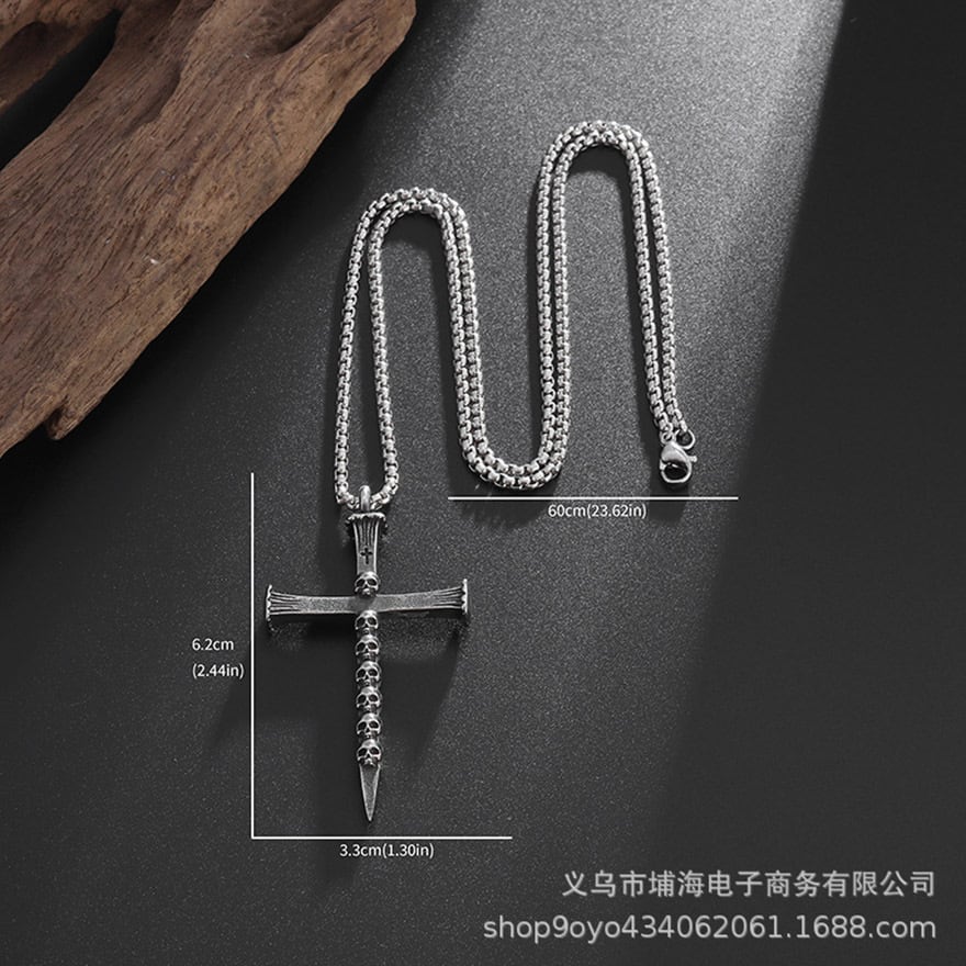 大きな釘を組み合わせて作られたような、重厚感あふれる十字架のネックレスです。