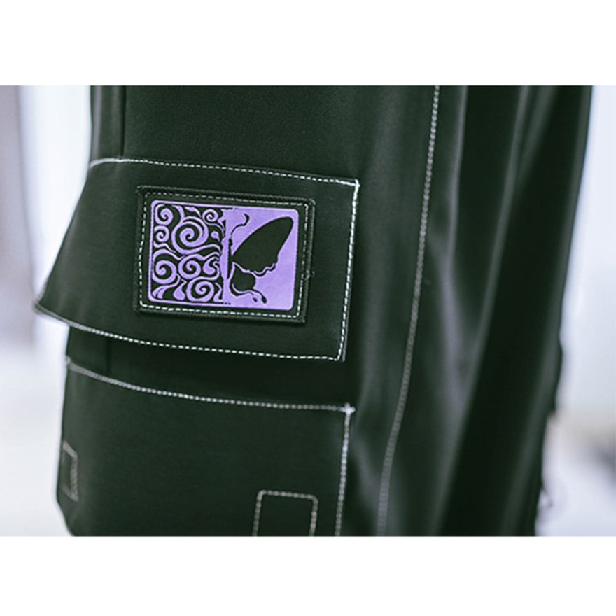 サイドの大きなカーゴポケットには、レースアップのディテールと紫のワッペンがあしらわれ、ハードな中にガーリーな遊び心をプラスしています。