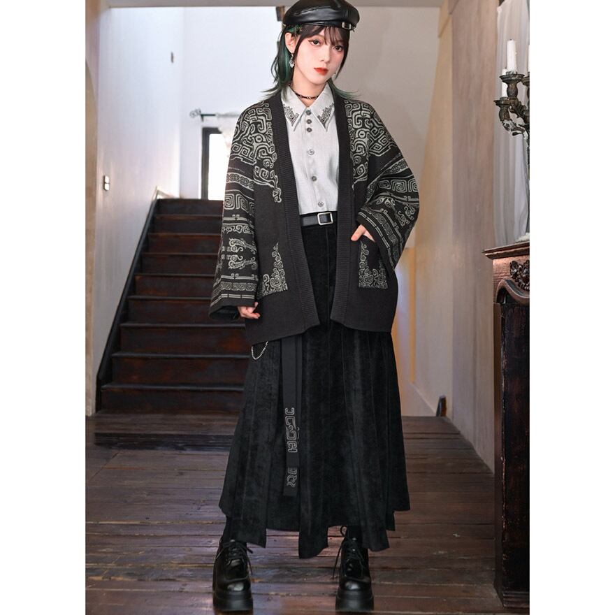 大人ゴシック 中華風 プリーツスカート 秋冬 コーデュロイ 厚手 ロング丈 古怪舎
