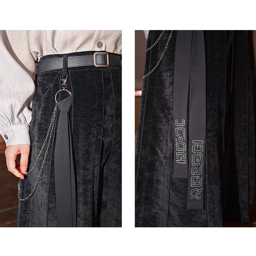 最大の特徴は、取り外し可能なチェーンと、中華風の文字刺繍が施されたロングストラップ。アシンメトリーに揺れるデザインが、ダークでミステリアスな雰囲気を一層引き立てます。