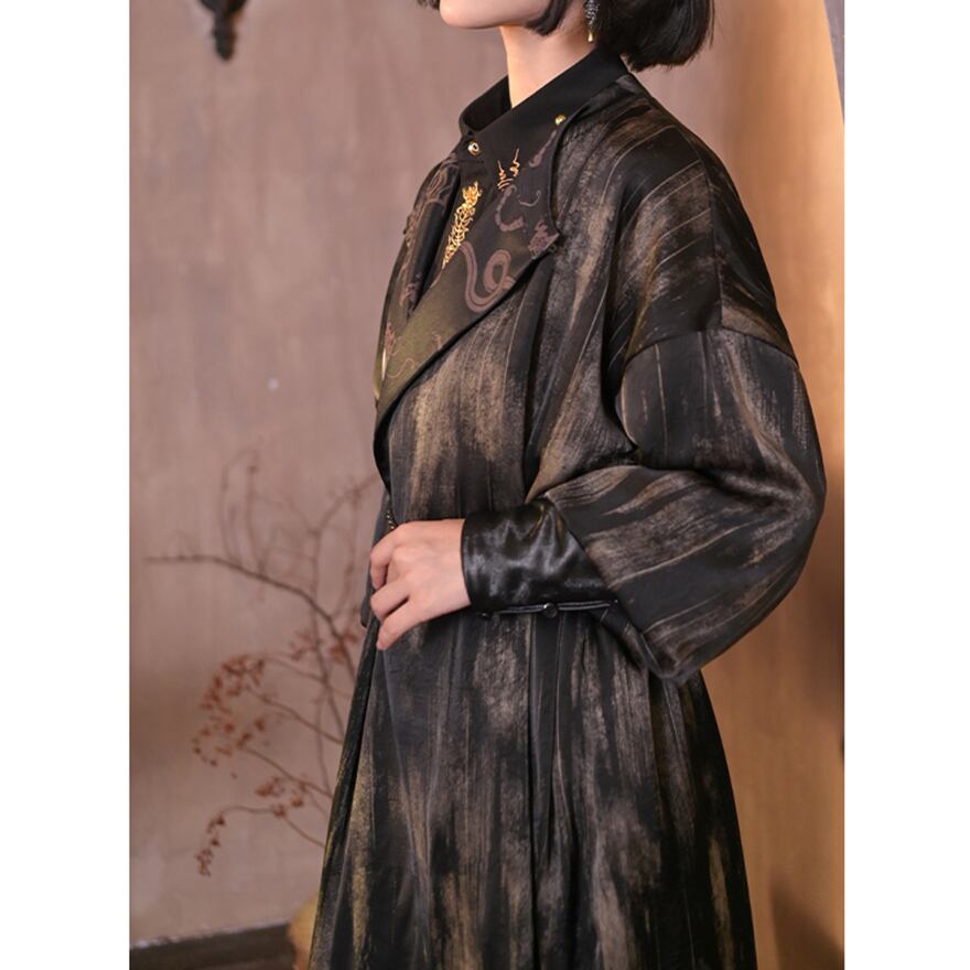 光沢のある滑らかな生地が、動くたびに美しいドレープを生み出し、優雅でミステリアスな雰囲気を演出。