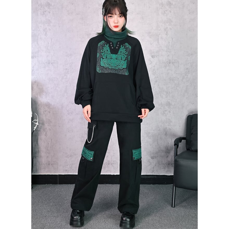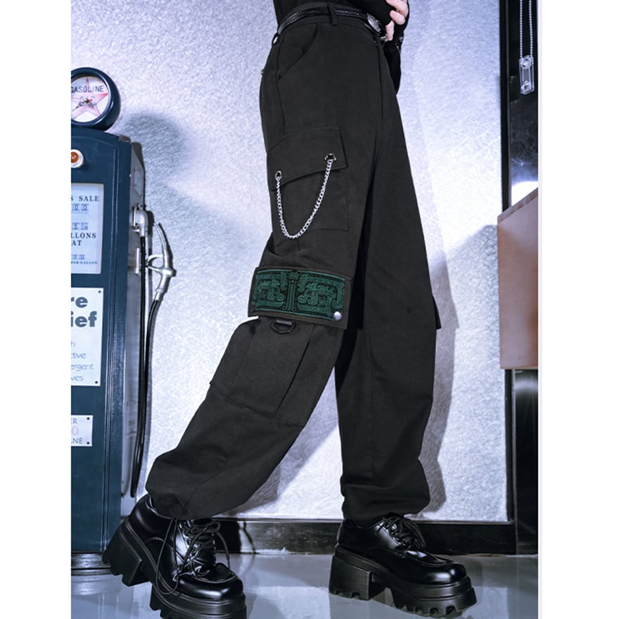 武骨なカーゴパンツのデザインに、東洋の神秘的なエッセンスを融合させた、独創的な一本。