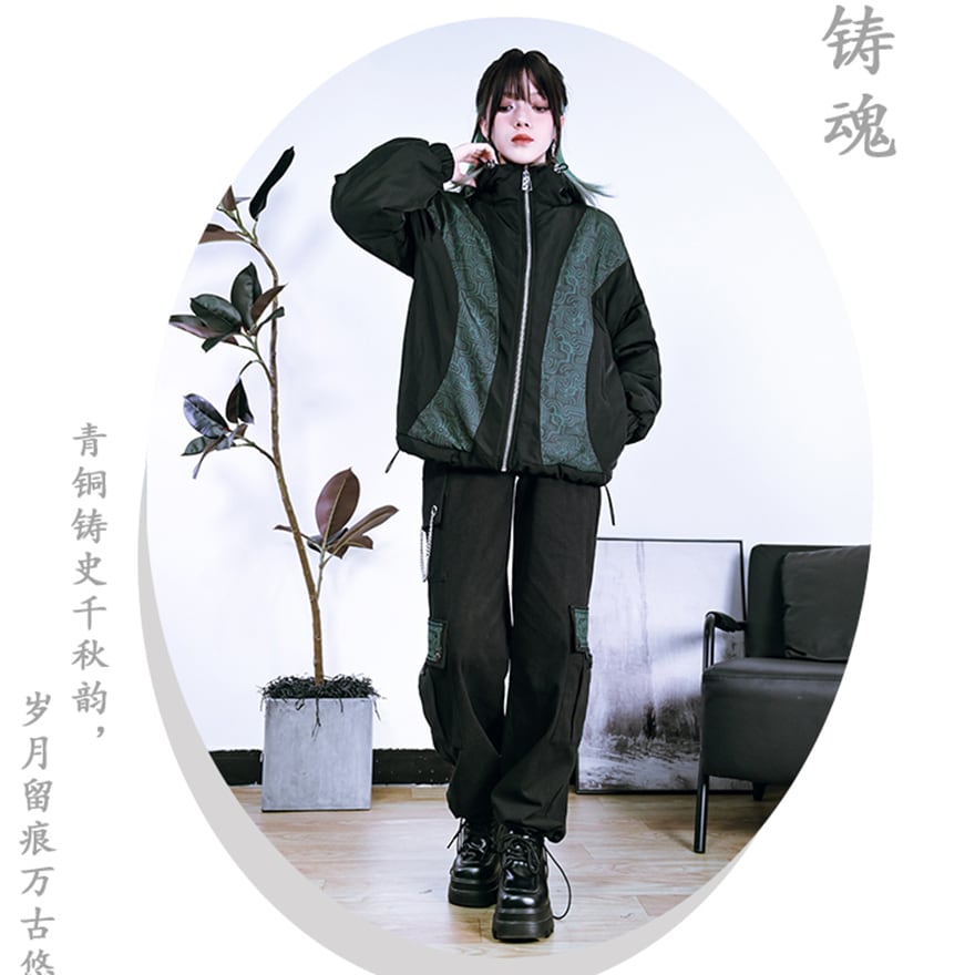最大の特徴は、サイドポケットにあしらわれた、古代の青銅器を彷彿とさせるような、ミステリアスなグリーンのパッチ。緻密で立体的な紋様が、他にはない唯一無二の存在感を放ちます。