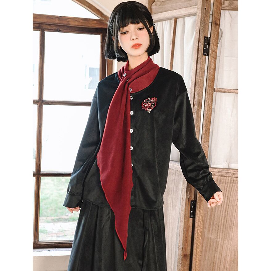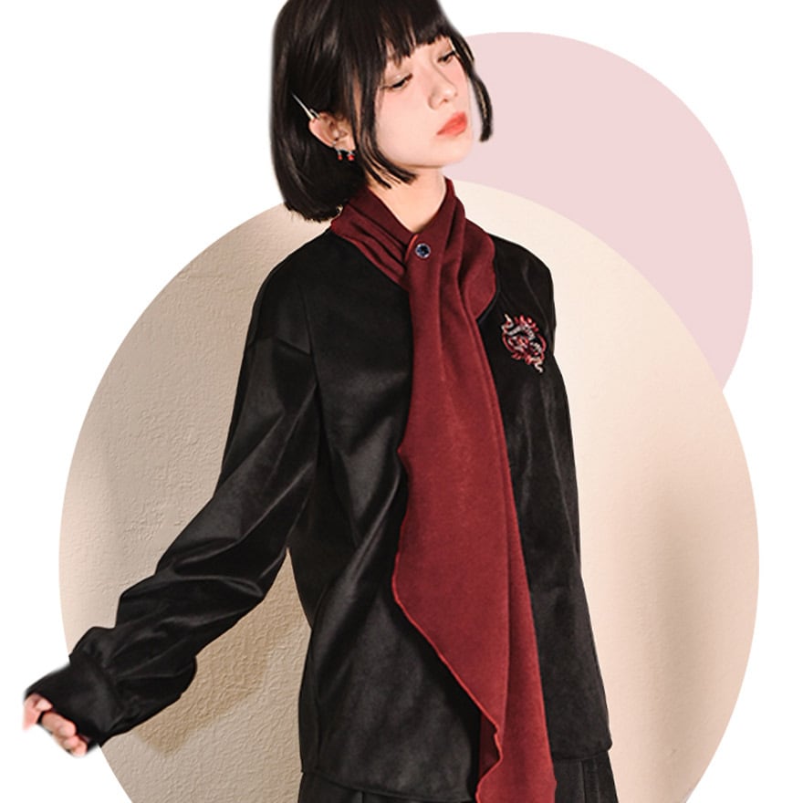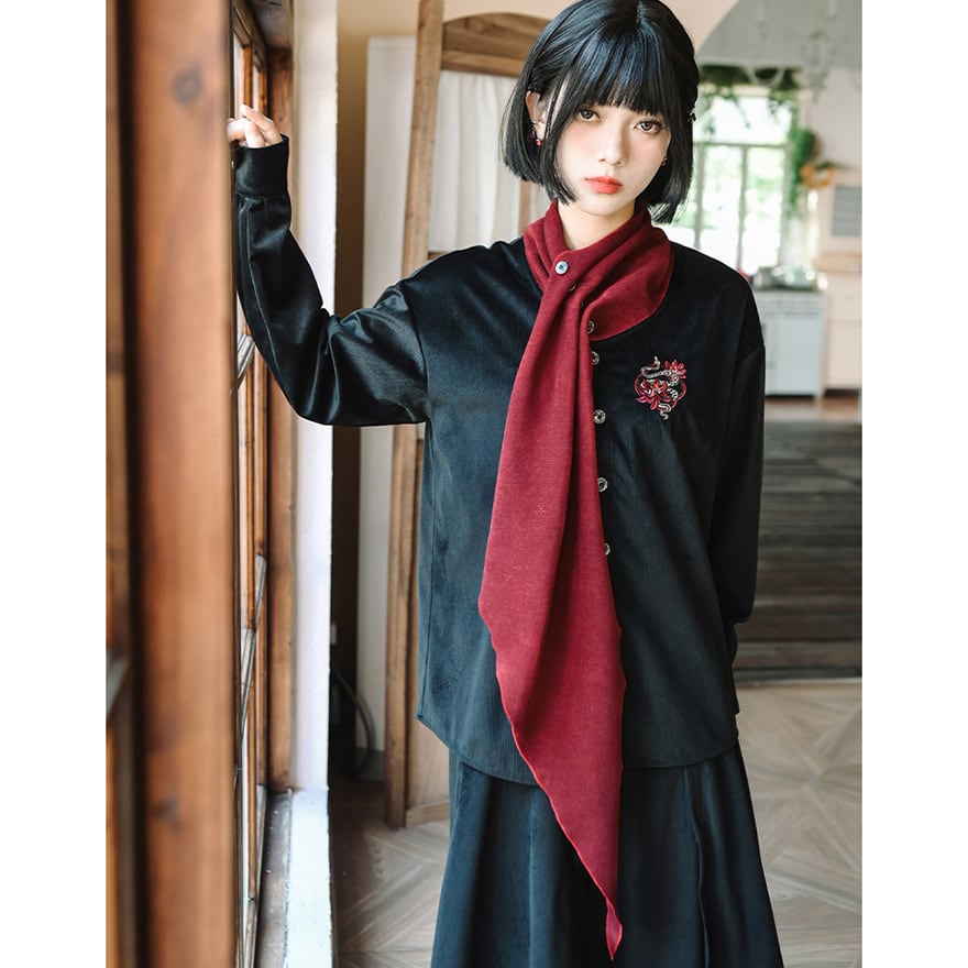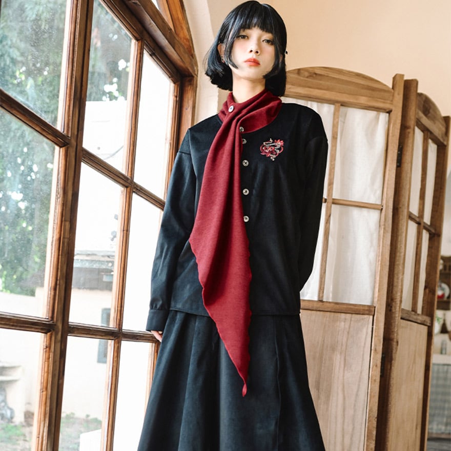 サブカル 服 地雷系 チャイナ風 ドレスシャツ 刺繍 スカーフ風 個性的 秋冬服 アラサー