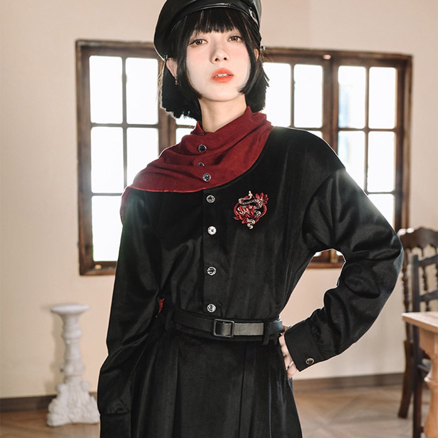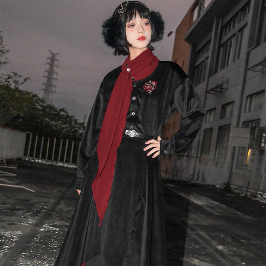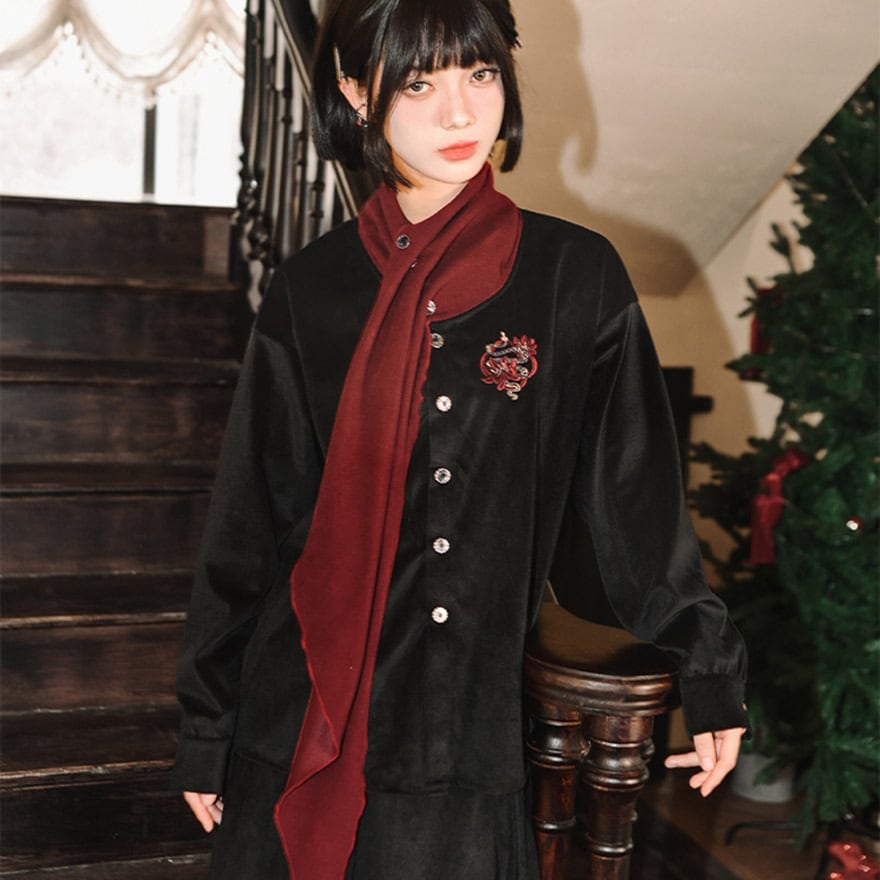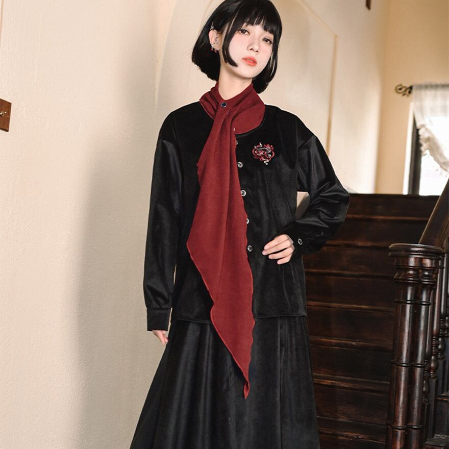 サブカル 服 地雷系 チャイナ風 ドレスシャツ 刺繍 スカーフ風 個性的 秋冬服 アラサー