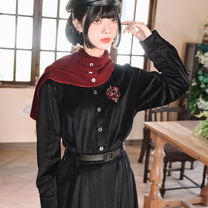 漆黒のコーデュロイ生地に、目を引く深紅のスカーフが一体化したデザイン性の高いドレスシャツです。