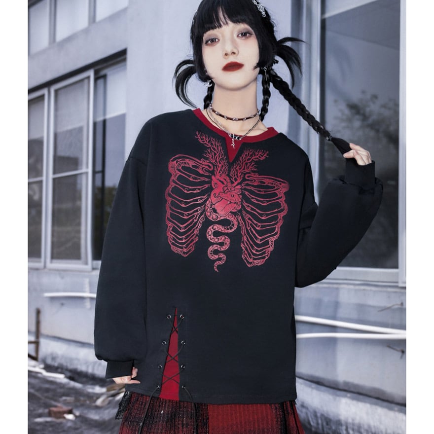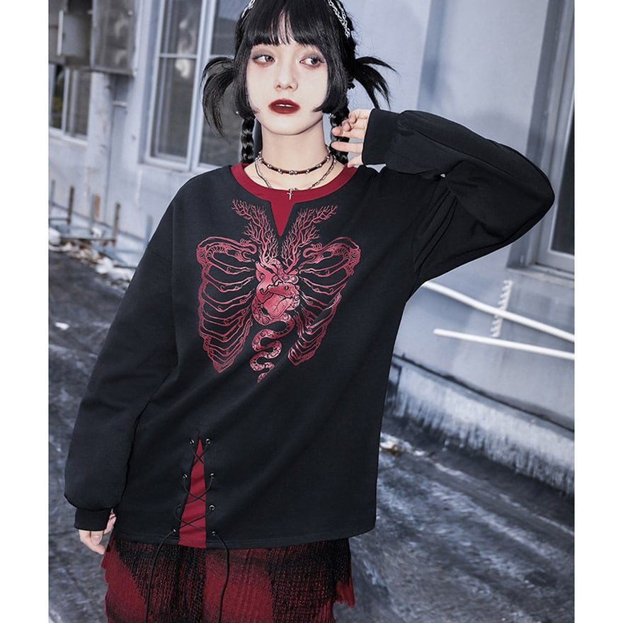ブラックのスウェット生地に、鮮烈な赤で描かれた肋骨と心臓のプリントが目を惹くデザイントレーナーです。