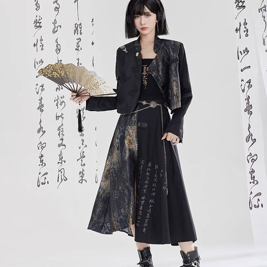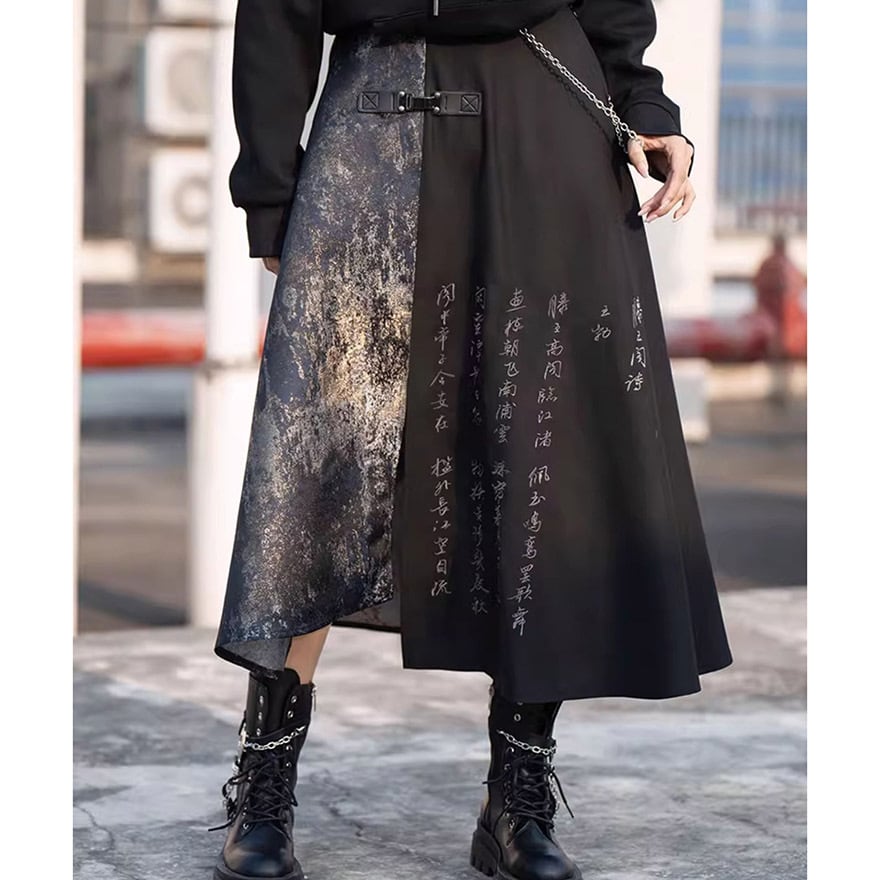 流麗な書がプリントされた漆黒の生地と、古びた金属や壁画を思わせるアーティスティックな生地を大胆に切り替えた、アシンメトリーデザインのロングスカートです。