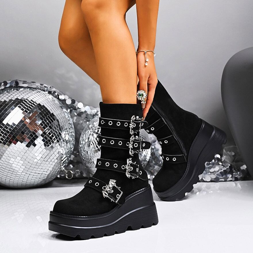 マットな質感のブラックがシックな印象を与える、厚底ウェッジソールブーツです。
