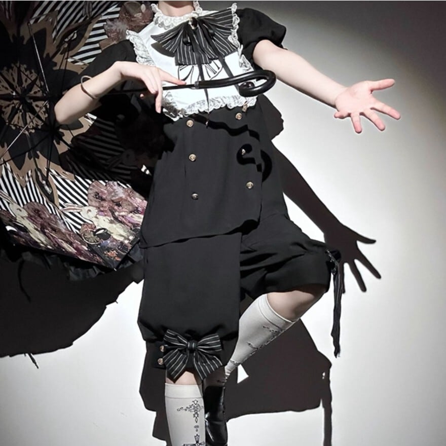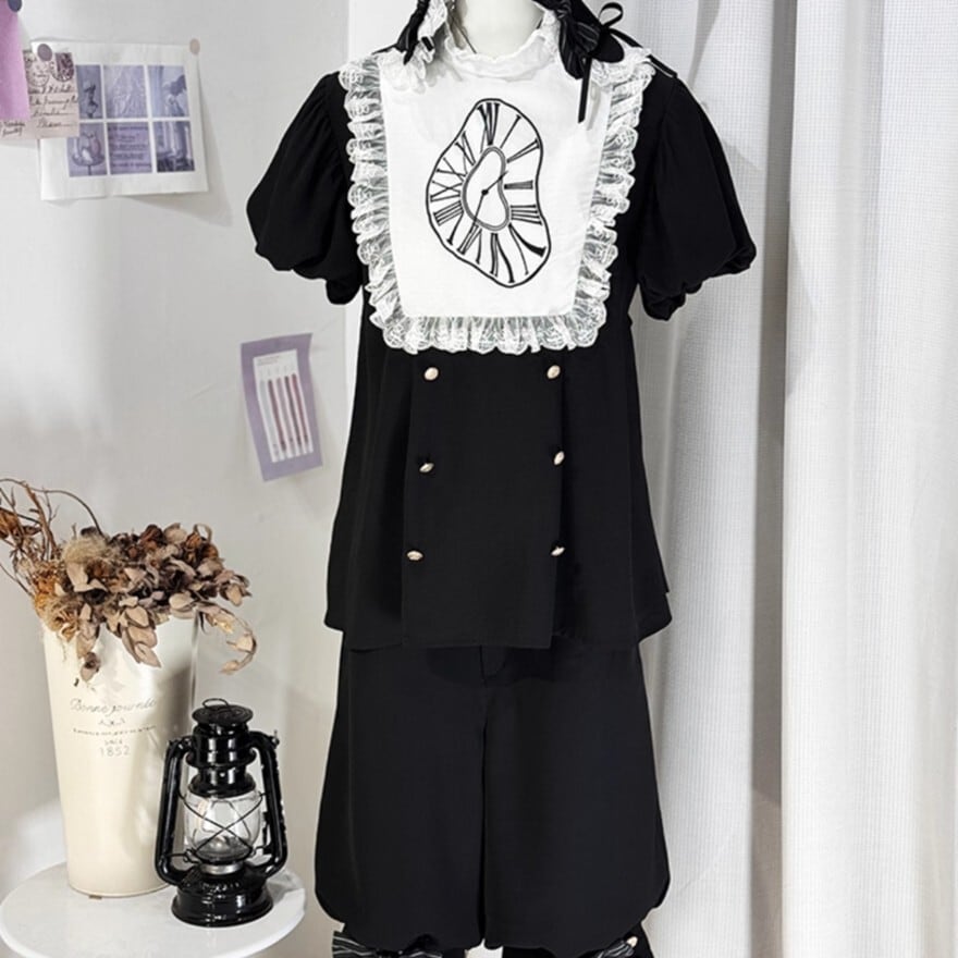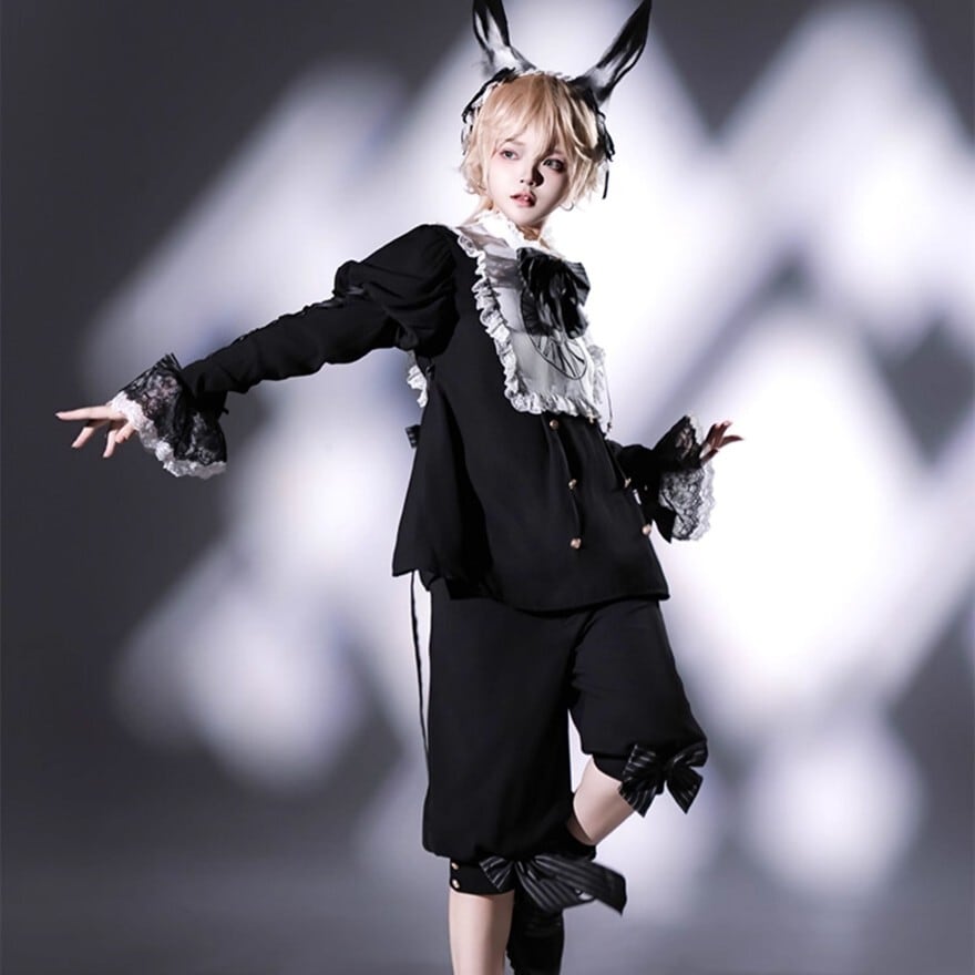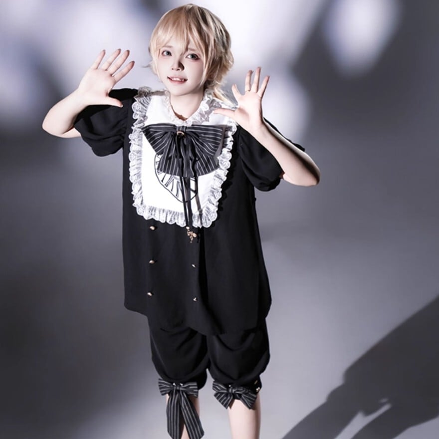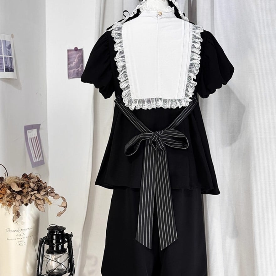 ブラックの生地に、オフホワイトの繊細なレースが襟元、袖、そしてズボンにあしらわれた、クラシカルロリータのセットアップです。