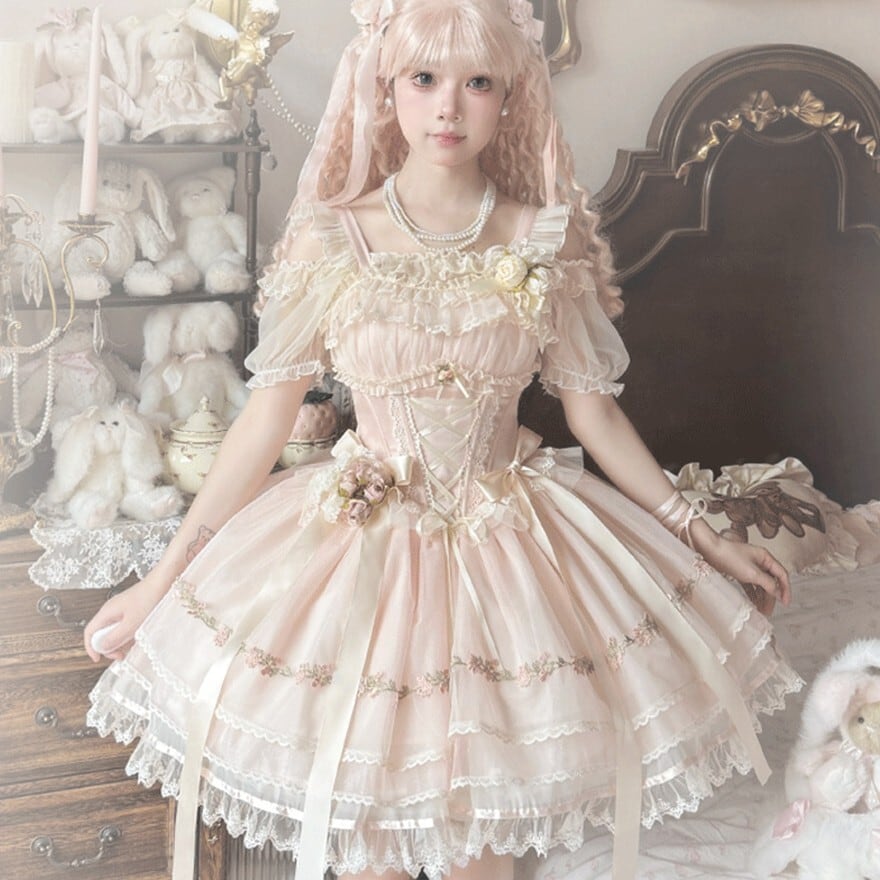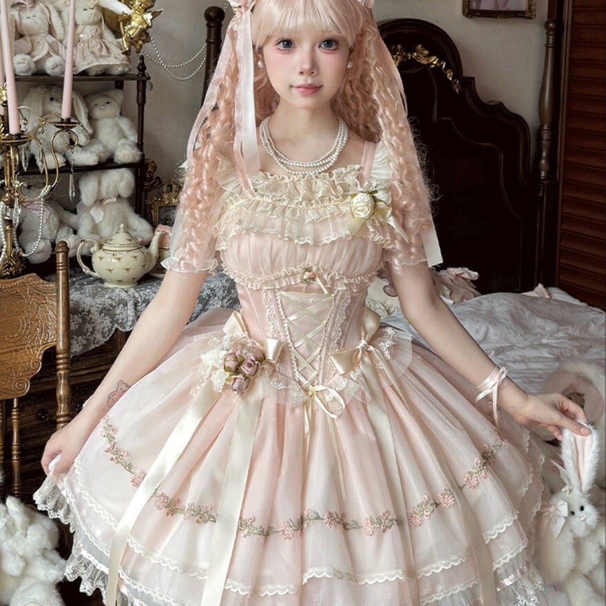 淡いピンク、グリーン、オフホワイトの生地に、同系色の繊細なレースやフリル、そして小さなバラの刺繍が全体にあしらわれた、可憐なロリータワンピースです。