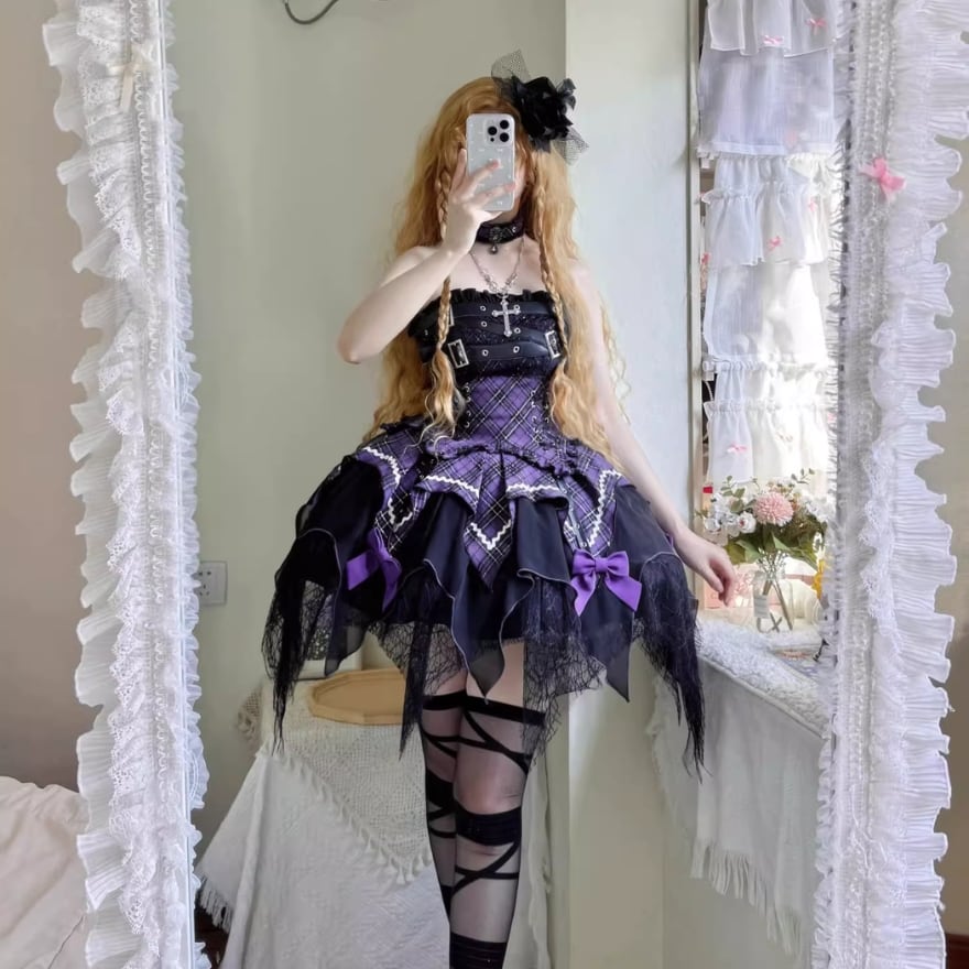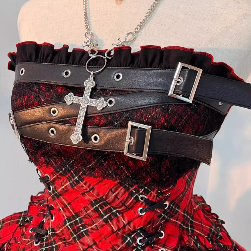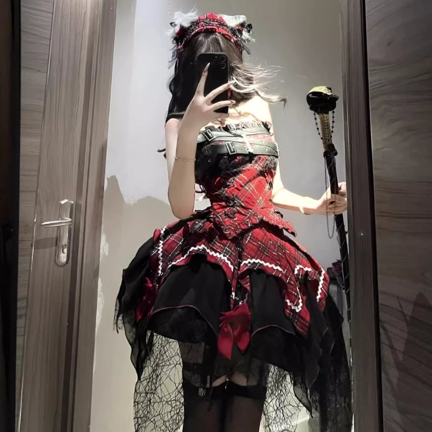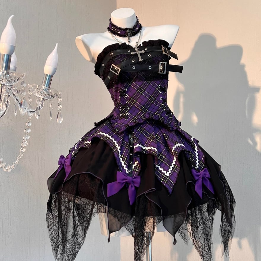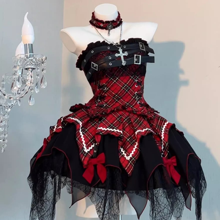 ふんわりレイヤードのチェック柄スカートにキュッと絞られたウエストレース編み上げが可愛いパンク、ロックイベント衣装におすすめなジャンパースカートです