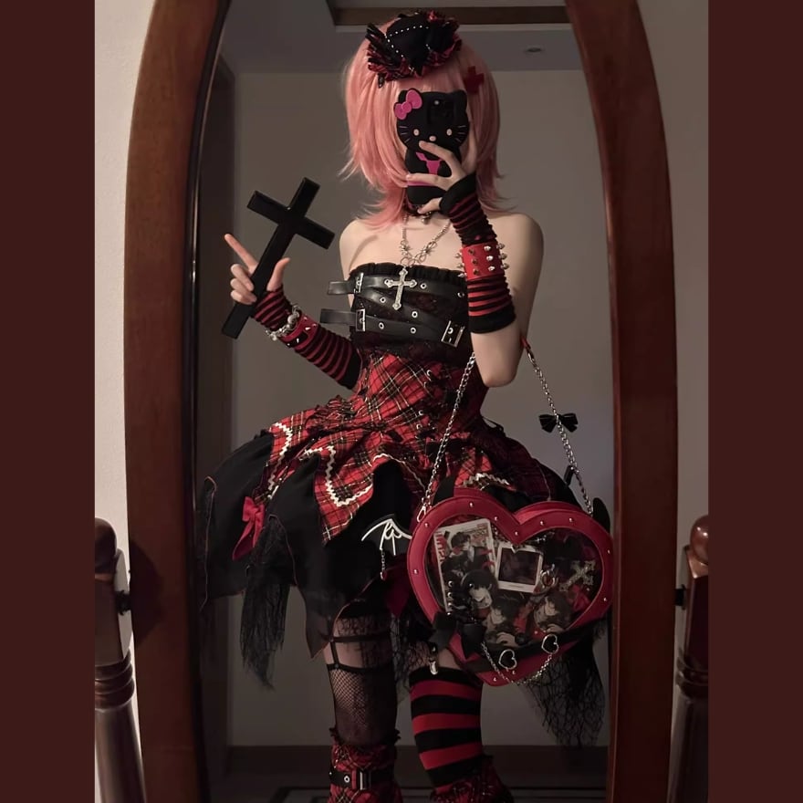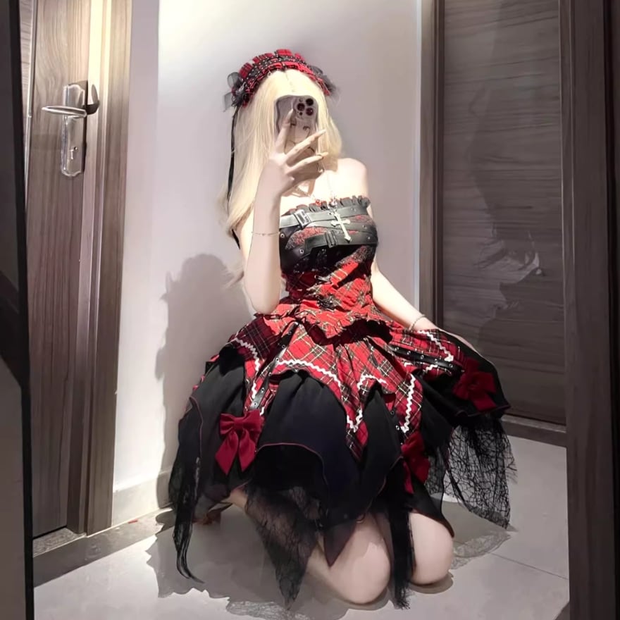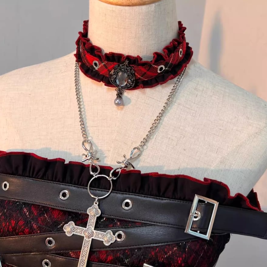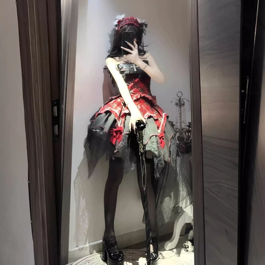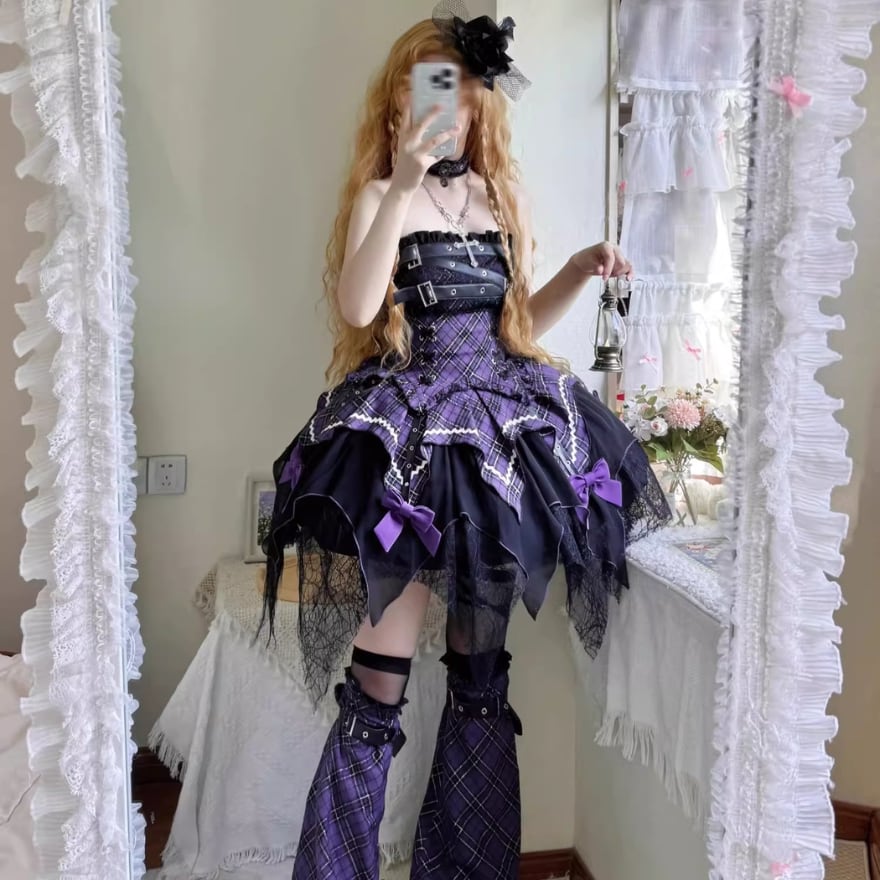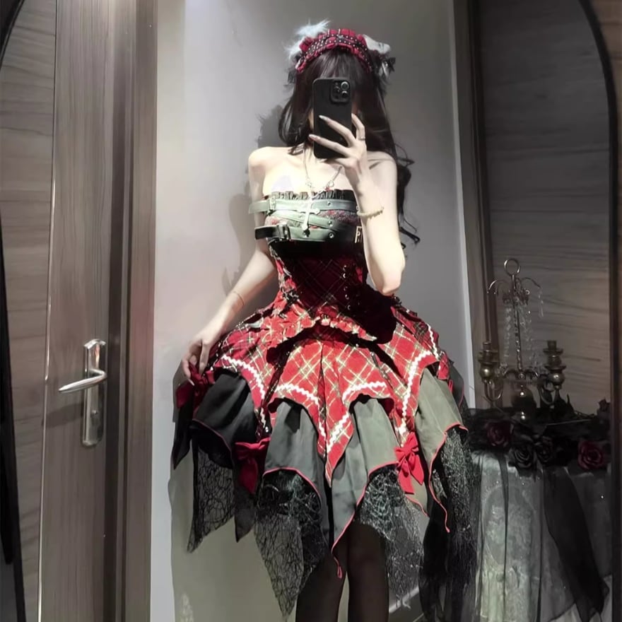 ふんわりレイヤードのチェック柄スカートにキュッと絞られたウエストレース編み上げが可愛いパンク、ロックイベント衣装におすすめなジャンパースカートです