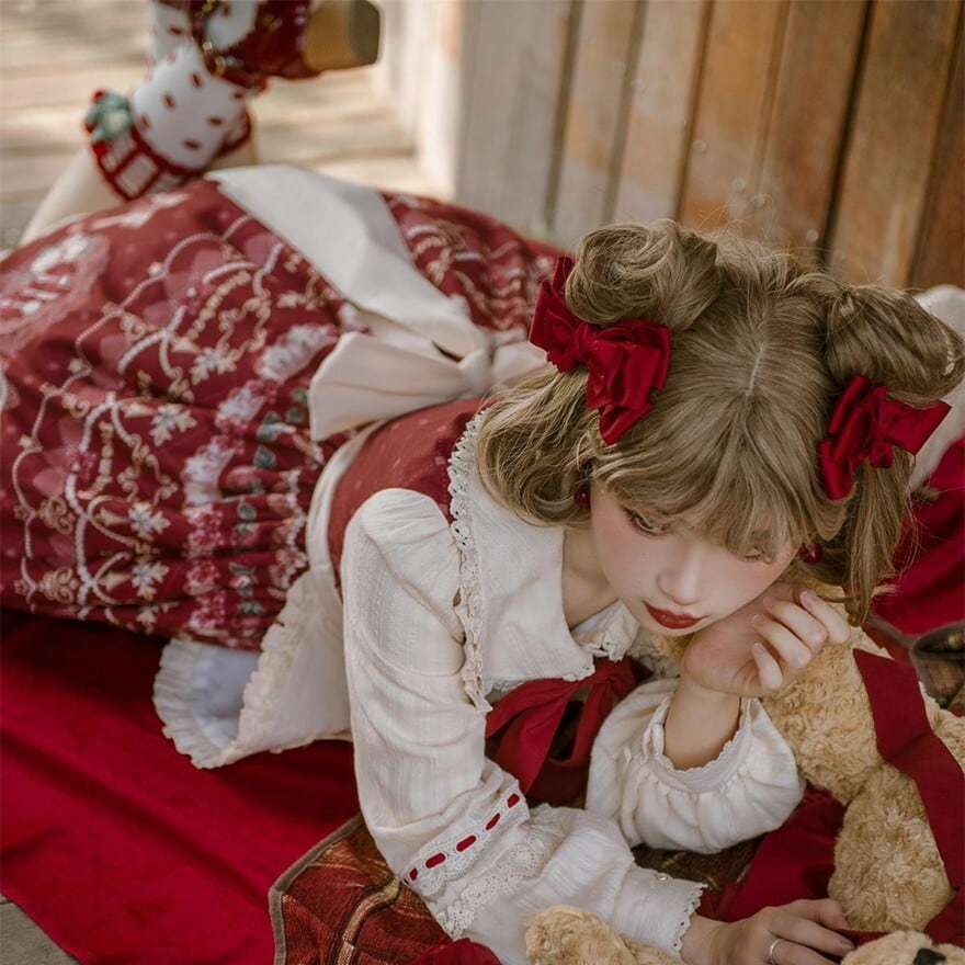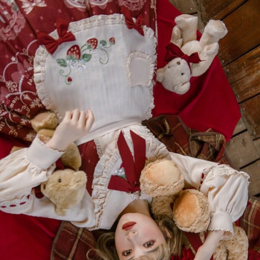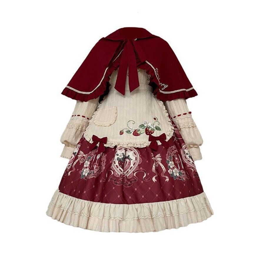 ボルドーとアイボリーの組み合わせが可愛らしい、長袖ワンピースとケープのセットです。ワンピースのスカート部分には、ストロベリーやリボン、ハートなどのプリントが全面に施されており、可愛らしい世界観を演出します。ブラウスのように見える上身頃と、エプロンのようなウエスト部分のデザインもユニークで魅力的です。ケープには、"Strawberry"の刺繍とフリルが施され、セットで着用するとさらに華やかさが増します。
