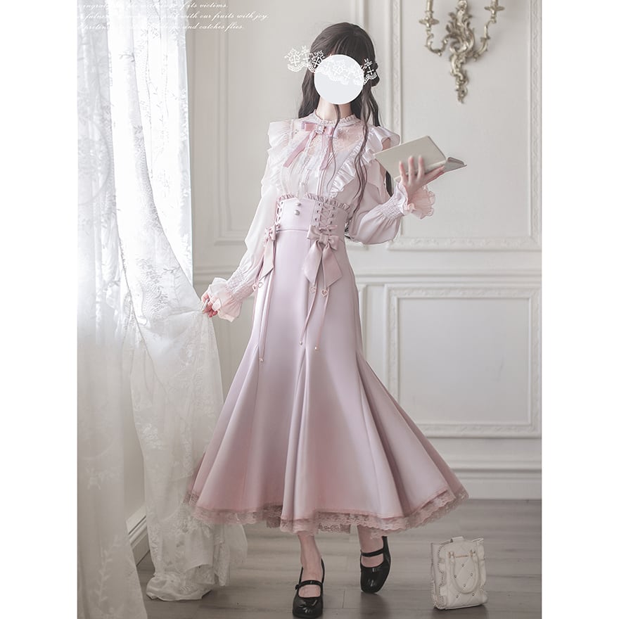 量産型 ロリィタ スカート マーメイドライン ハイウエスト 編み上げ ロング ピンク 清楚系 胡桃木