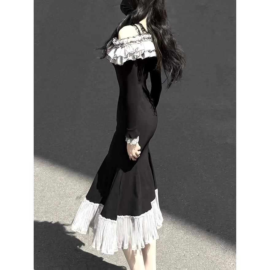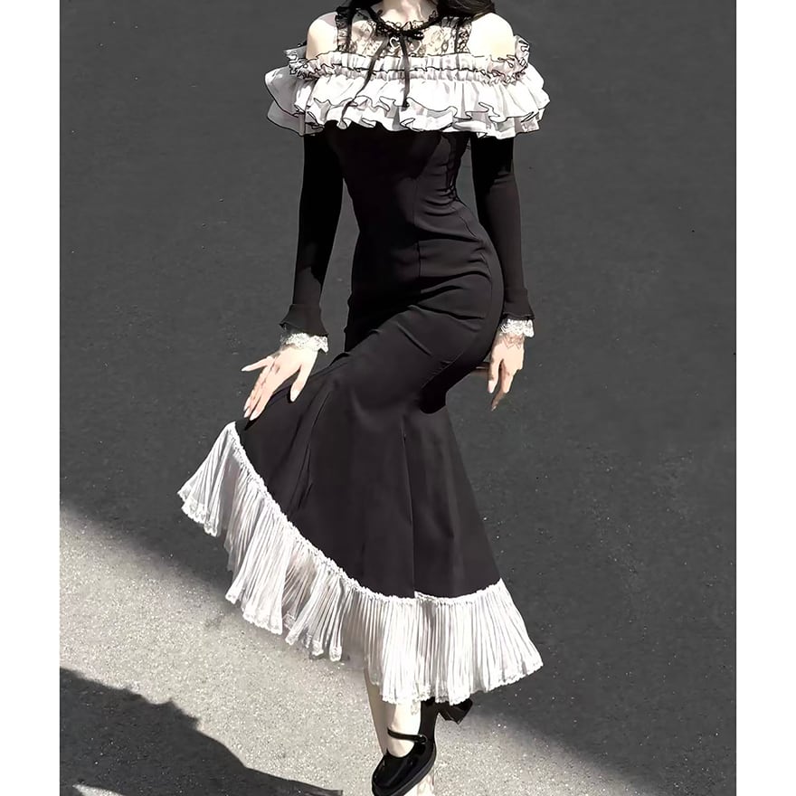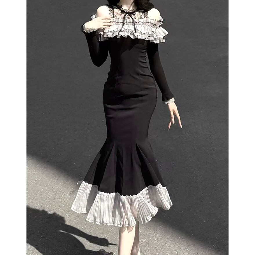 マーメイド ワンピース フリル オフショルダー 黒 グレー ロング丈 大人かわいい ロリィタ 胡桃木