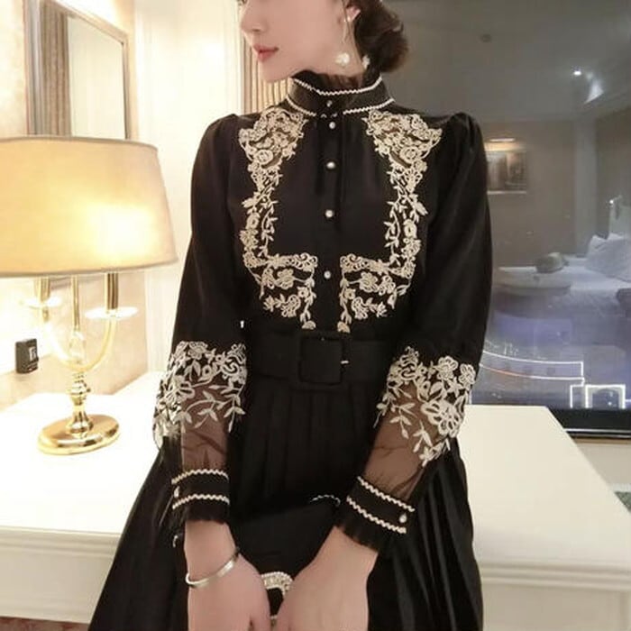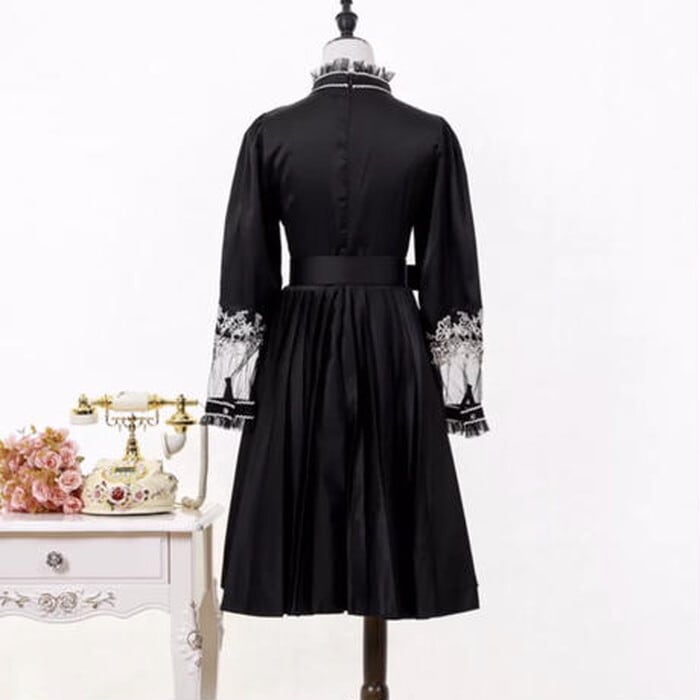 ブラックのワンピースに精巧な花柄刺繍が上品でもあり、ゴシックな雰囲気も併せ持つエレガントなワンピースです。レース使いも上品でパーティや女子会、お呼ばれに最適なアイテムです。