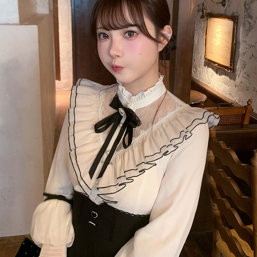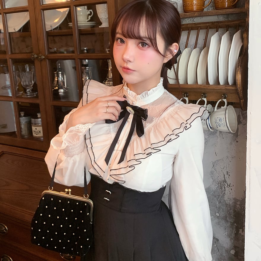 胸元には幾重にも重なるフリルがあしらわれ、黒いラインの縁取りがアクセントに。袖はふんわりとしたボリュームスリーブで、手元を可憐に演出します。